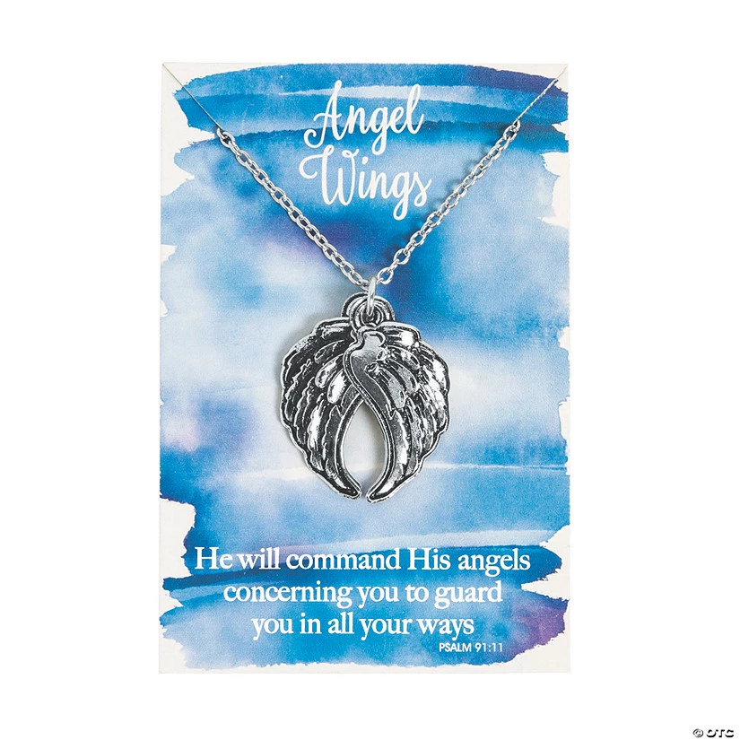 Always feel like an angel is watching over with these beautiful necklaces. Each features two angel wings on a high-quality chain and they come on cards with Psalm 91:11. These necklaces make amazing religious gifts and keepsakes that your loved ones will treasure. Metal. 1 3/4″ x 1 1/4″ charm on an 18″ chain with lobster clasp with 2 1/2″ x 3 3/4″ cardstock card. © OTC