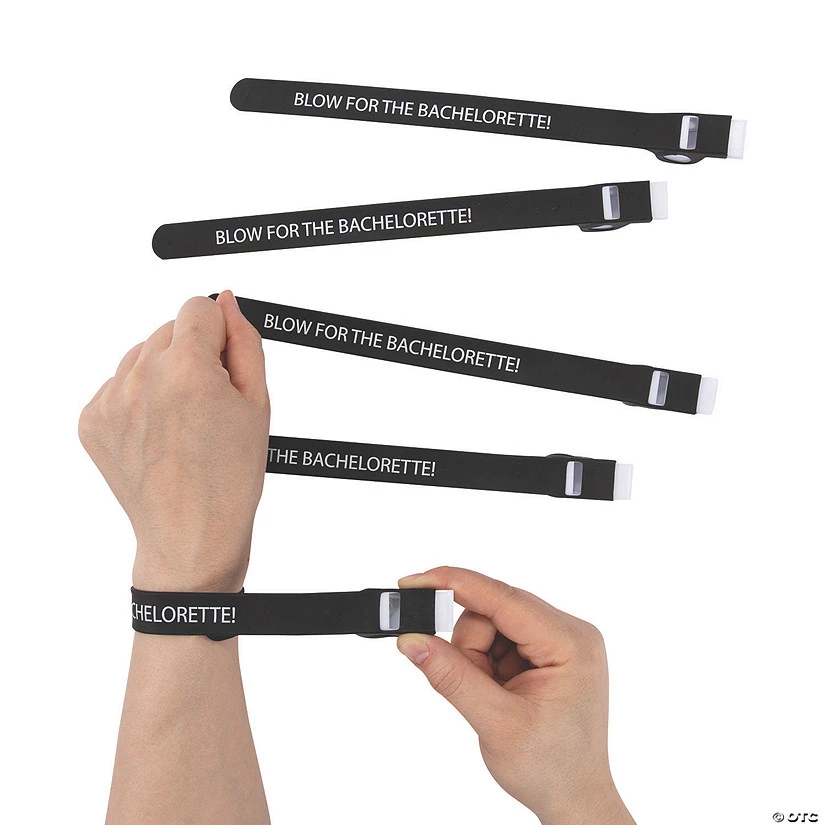 Toot, toot – here comes the bachelorette! Add these party whistles to your bachelorette party supplies to really turn heads wherever you go! The bride’s crew can wear them at the party or hand them out as the bar hop! The black slap bracelets include white whistles and are printed with, “Blow for the bachelorette!” (6 pcs. per unit) 8″ silicone bracelet with 1 1/2″ plastic whistle.