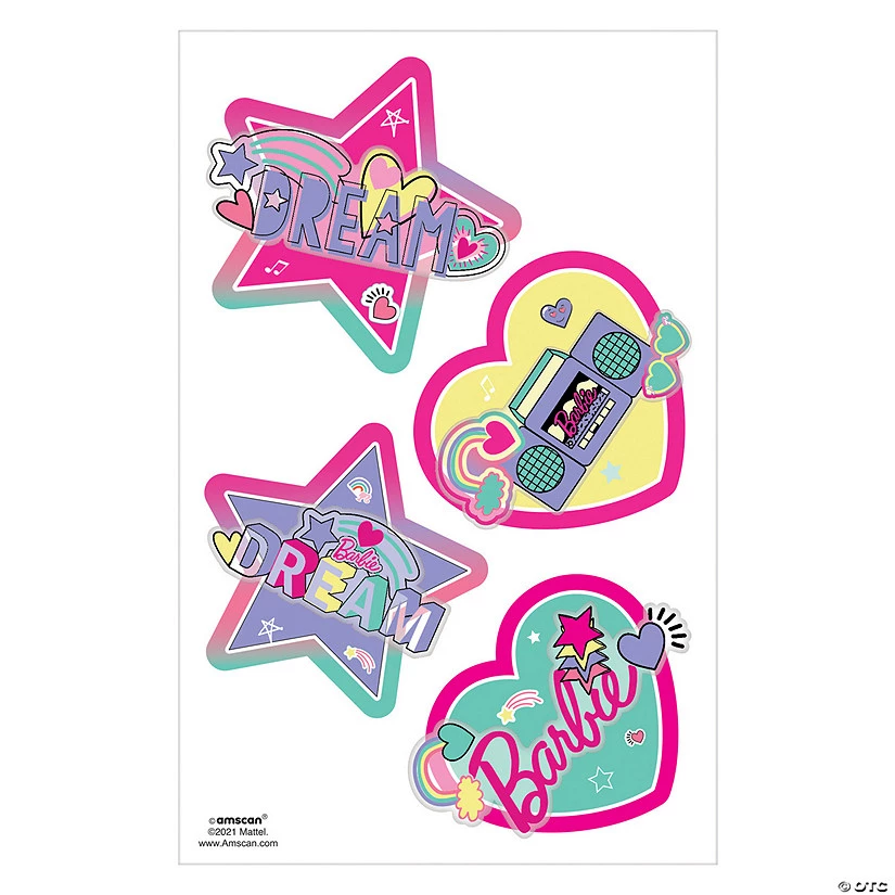 Remind young Barbie fans to dream big with the help of these colorful tattoos! These star- and heart-shaped temporary tattoos feature hearts, rainbows and other fun designs on brightly colored backgrounds. Apply them as fun party activities or drop them into birthday party favor bags that guests can take home and enjoy! Easy to apply and remove. Paper. (4 pcs. per unit) Safe and non-toxic. 4″ x 8″ © 2022 Mattel. All Rights Reserved. BARBIE and associated trademarks are owned by and used under license from Mattel.