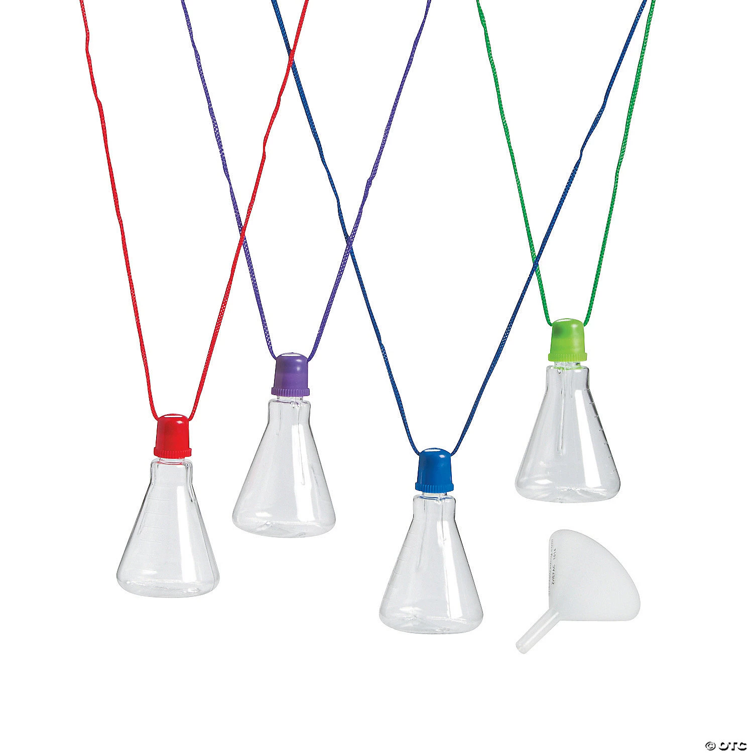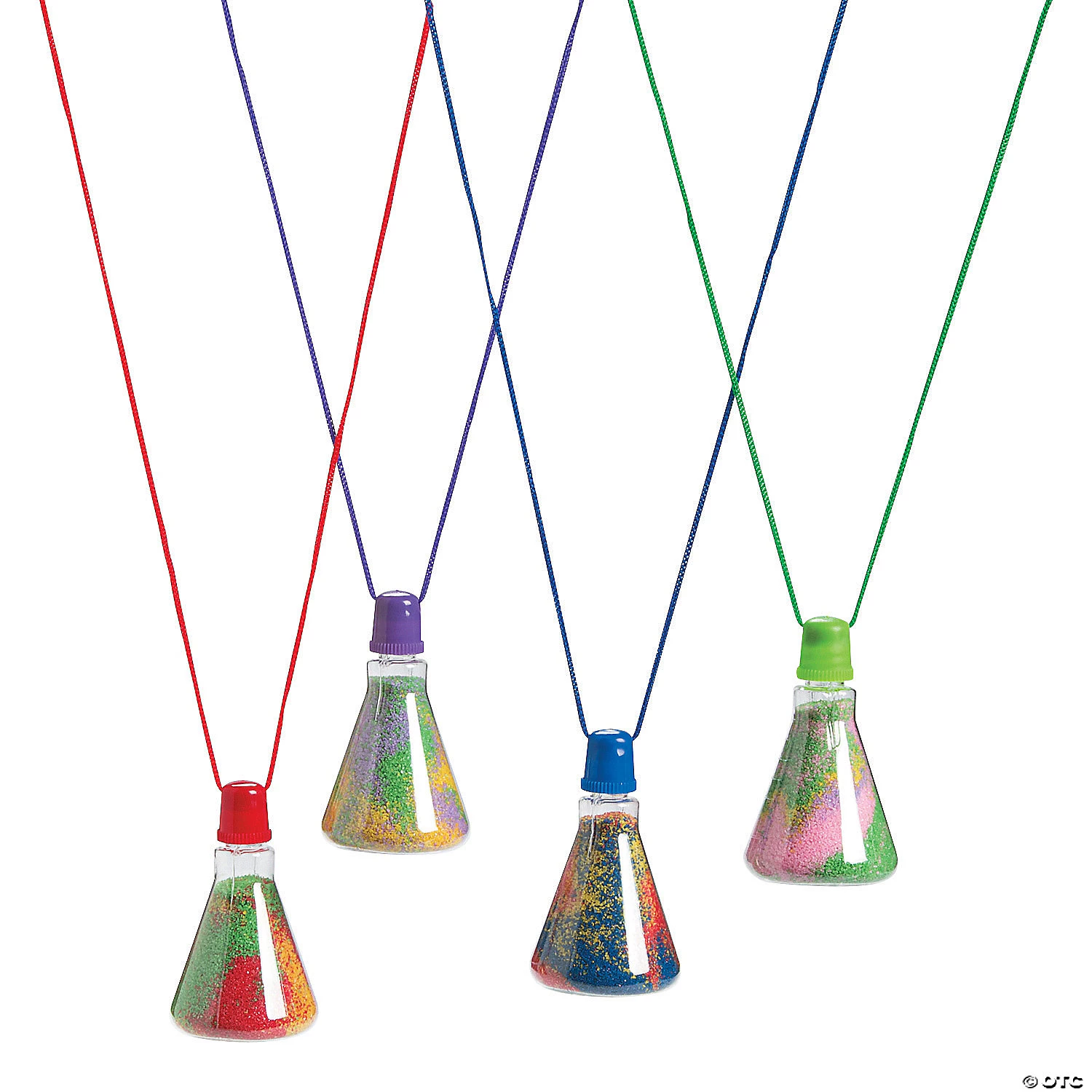 Concoct a cool sand art necklace! Use these Beaker Sand Art Bottle Necklaces as a DIY art project or include it into your VBS lesson plans or summer camp activities! Includes 1 plastic funnel. Requires 58.5 grams sand per sand art bottle. It takes around 25 oz. of sand to fill all 12 beakers. Plastic. 1 1/2″ x 2 1/4″ with a 30″ satin breakaway cord. Sand not included. © OTC.