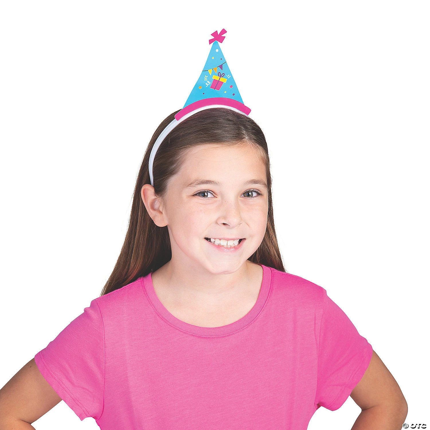 No birthday celebration is complete without some silly headgear! These cute birthday headbands feature party images and bright colors. No uncomfortable elastic chin strap needed for these party hats – these headbands are easy and fun! Hand these out to party guests or have them handy by the birthday photo booth for some great photos. Cardstock and plastic. 4″ x 4 3/4″ topper on 5″ x 5″ headbands. © OTC