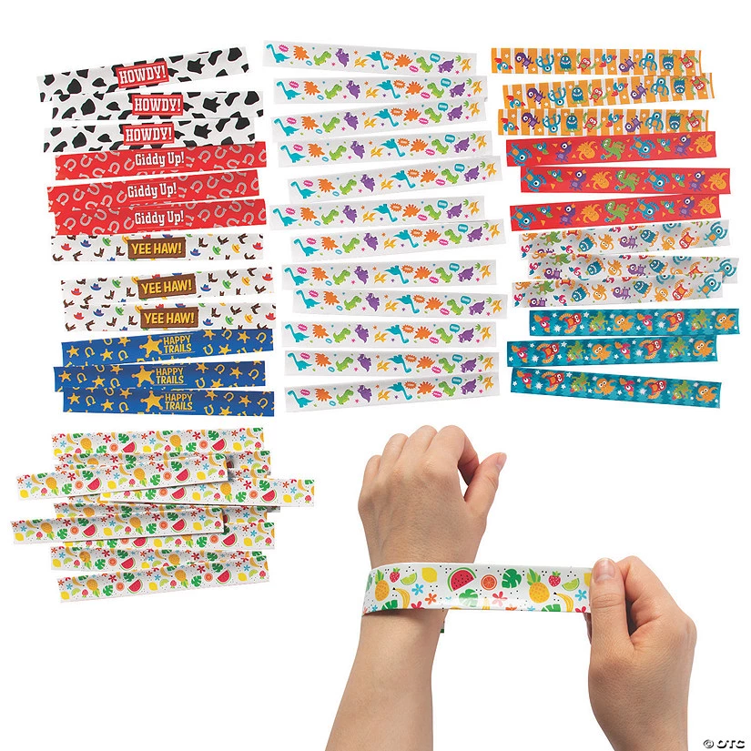 Slap bracelets are fun and kids love them! This assortment of slap bracelets has fun designs and images on the bracelets including funny characters, fruity designs and Western-themed images. Fantastic as classroom rewards or birthday party favors, these slap bracelets will be a hit with the kids! Metal. (48 pcs. per unit) 9″