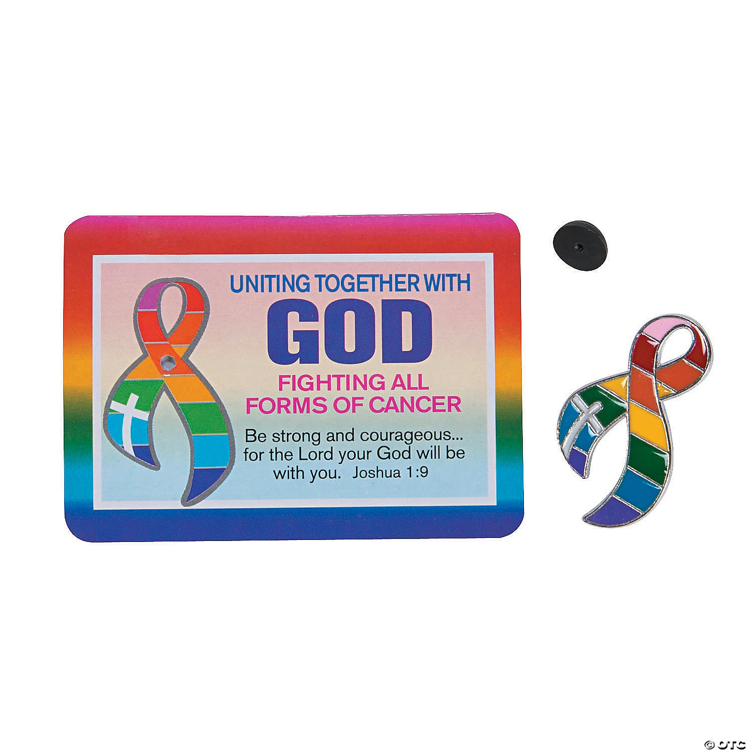 Pin on your support for cancer awareness with these faith pins! They’re great giveaways at fundraisers and benefit dinners that double as place setting cards. Hand them out to all your friends and loved ones during cancer awareness months to show your support for brave fighters and survivors. Check out our huge selection of cancer awareness craft kits, jewelry and supplies, available on this website. Card includes To/From space and is pre-printed with a message of faith. 1″ x 2″ metal pin on a 3 1/2″ x 2 1/2″ paper card. © OTC