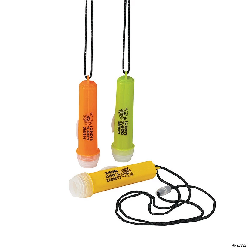 Bring light to dark situations with these Christian Pumpkin Flashlight Necklaces. Decked out in different colors, each 3 1/2″ plastic flashlight is on a 36″ nylon cord. Hand them out to Sunday School students for a job well done. Requires 1 “AA” battery, not included. © OTC