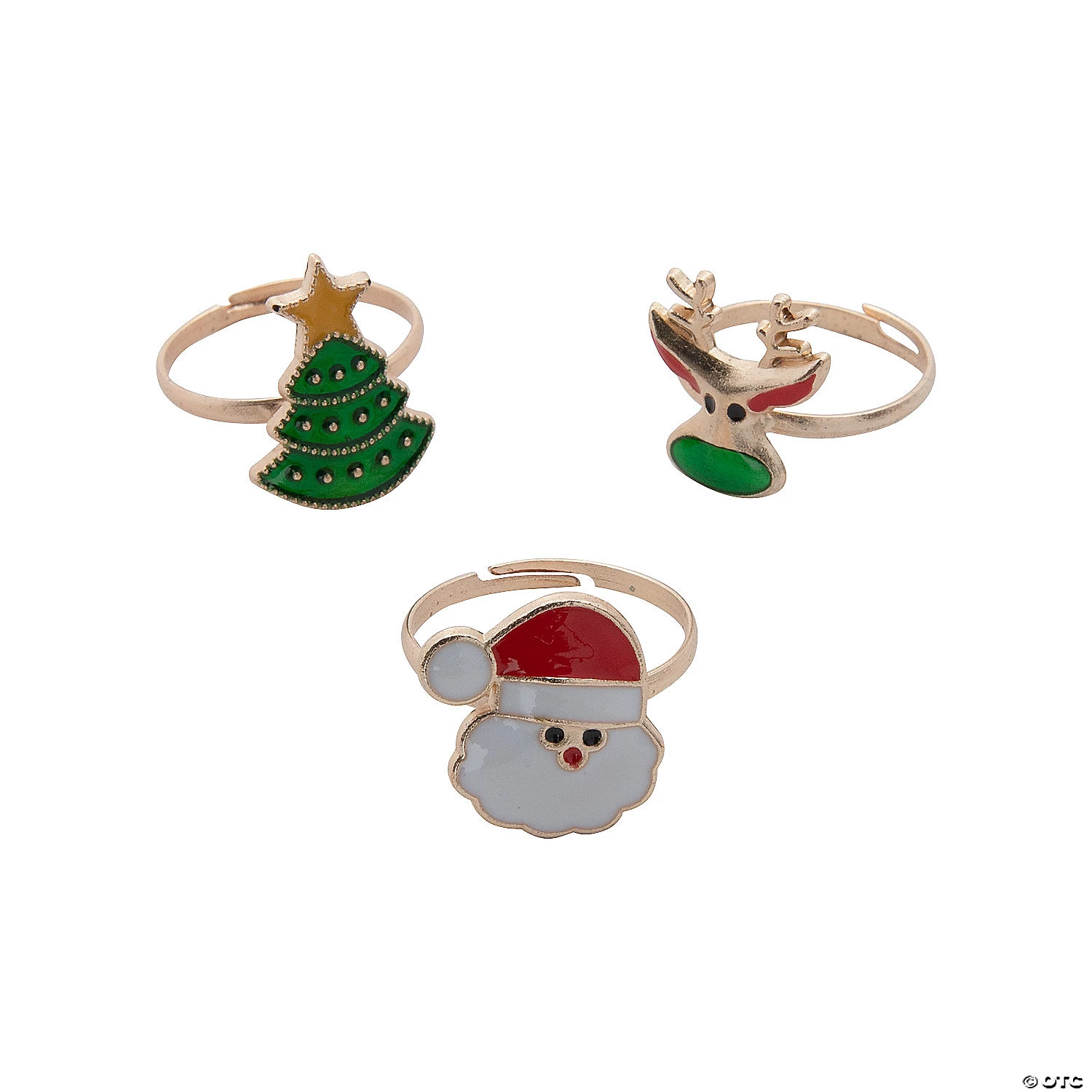 This beautiful assortment of golden rings comes straight out of a Christmas carol to help you win the hearts of everyone on your list! Each ring features an iconic Christmas symbol, such as a ruby-red Christmas tree, a jolly Santa Claus, and a red-nosed reindeer. Give these little sparklers away as gifts or wear one yourself to dress up your holiday outfit! Metal. 3/4″
