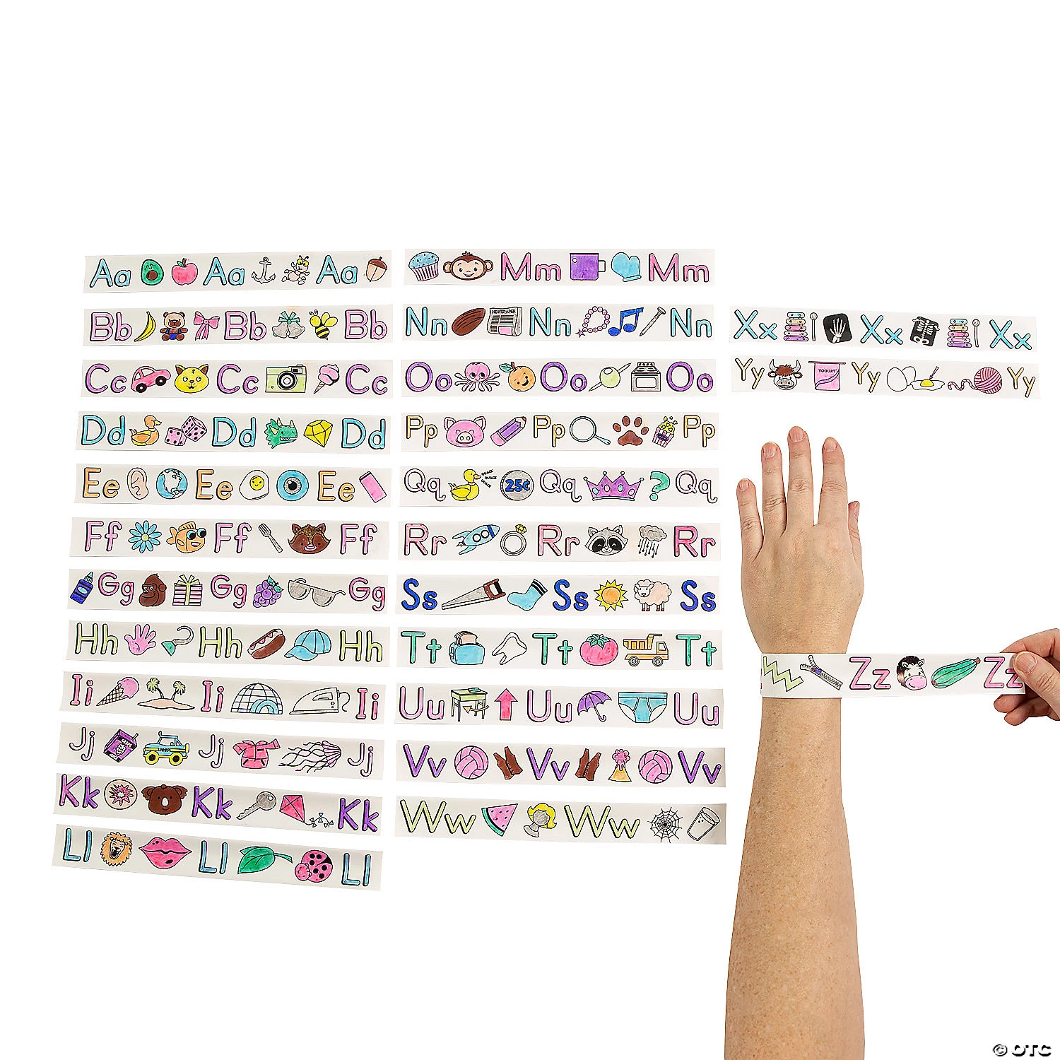 This fun coloring project will delight kids because the finished product is a slap bracelet they can wear! Each ready-to-color slap bracelet features a letter from the alphabet plus images of words beginning with that letter. Assign each student one letter or use this collection as a long project for one student in home learning to get through the entire alphabet. Metal. (26 pcs. per unit) 9″ x 1″ © OTC