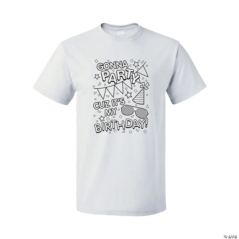 A birthdayâs a big deal! Make it extra special with this fun color-your-own t-shirt that allows kids to use their own coloring tools to decorate their shirts for their special day. With birthday party images and âGonna Party Cuz Itâs My Birthday!â written on the front and ready for coloring, kids will enjoy customizing their birthday shirt and making it unique! A fun birthday craft for a party or in the classroom, this shirt will help kids feel special! Š OTC⢠Brand: Fruit of the Loom⢠Short sleeve⢠High-density fabric⢠100% pre-shrunk cotton, 5.0 oz.⢠Tear away label⢠Double needle hemmed sleeves and bottom⢠Need more? With our tees, we’ve got your back (and front)! To order in bulk for any size group, just call 1-877-513-0384. Or, give us a ring if youâd like to easily customize any of our pre-printed shirts with our free design service.