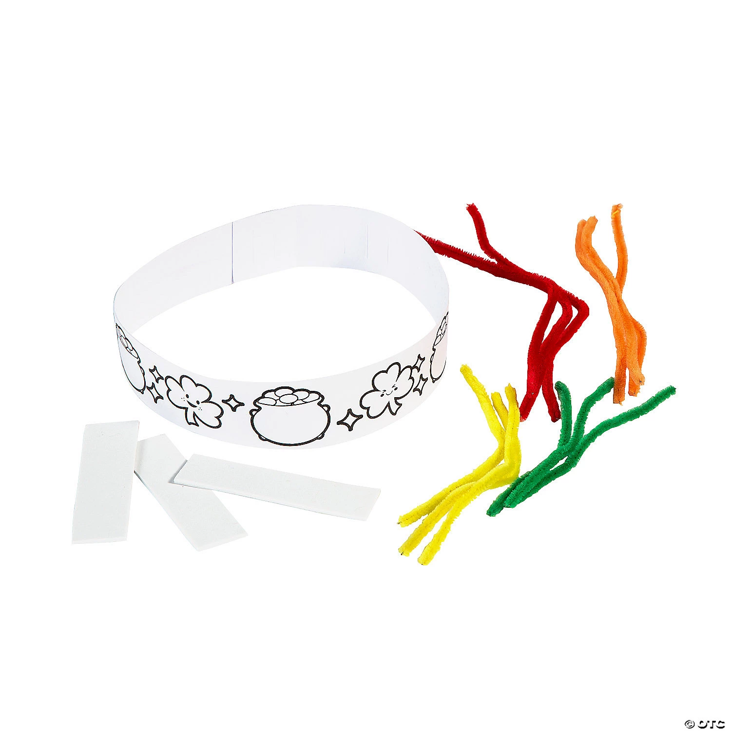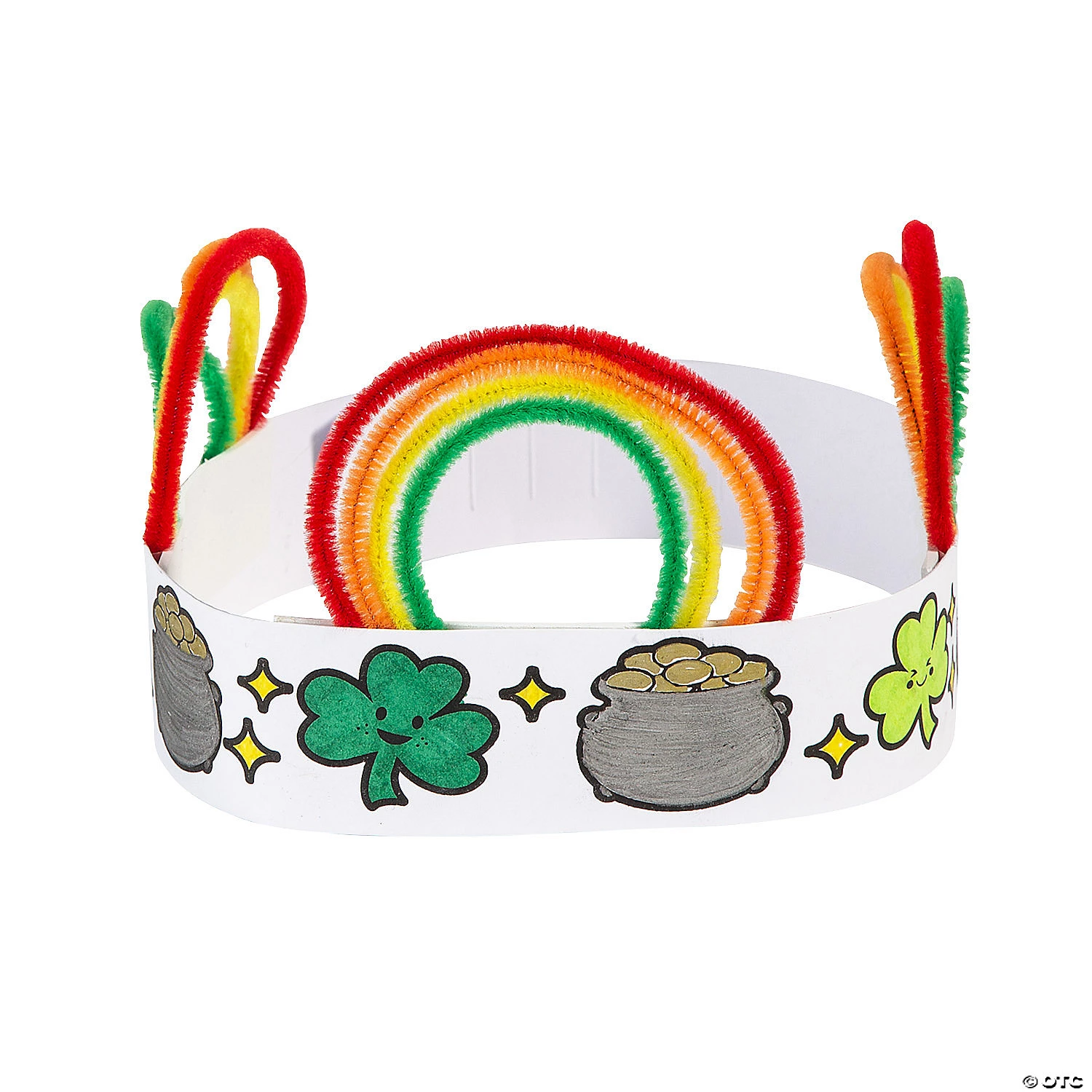 These lucky rainbows lead directly to pots of gold! A fun Saint Patrick’s Day party activity, kids can color in the images on these crowns, which include silly face shamrocks and pots of gold. Then simply attach the chenille stems to make colorful rainbows, fit the crown to their head and sport it with pride during Saint Patrick’s Day parades and other events! Includes chenille stems, double-sided adhesive foam pieces and tab and notch closure for adjustable fit. Cardstock. 22 1/2″ x 3″ Makes 12. All craft kit pieces are pre-packaged for individual use. Kits include instructions. © OTCColor Your Own Rainbow Crown Instructions