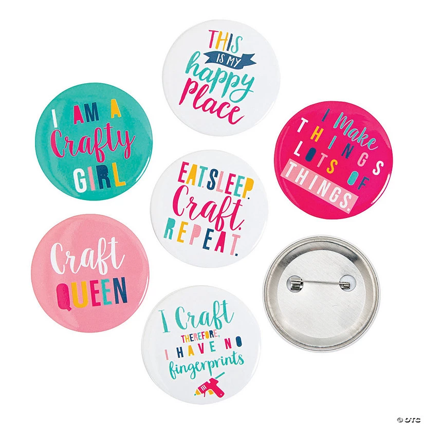 Eat. Sleep. Craft. Repeat. These Crafty Buttons capture your love for all things DIY! The colorful buttons are printed with phrases like, âCraft Queenâ and, âI make things. Lots of things.â Pin the buttons onto your crafting bag or apron to show them off! Hosting a girlsâ night filled with crafting projects? Use these pins as party favors! Metal. (2 dozen per unit) 2″ diam. © OTC