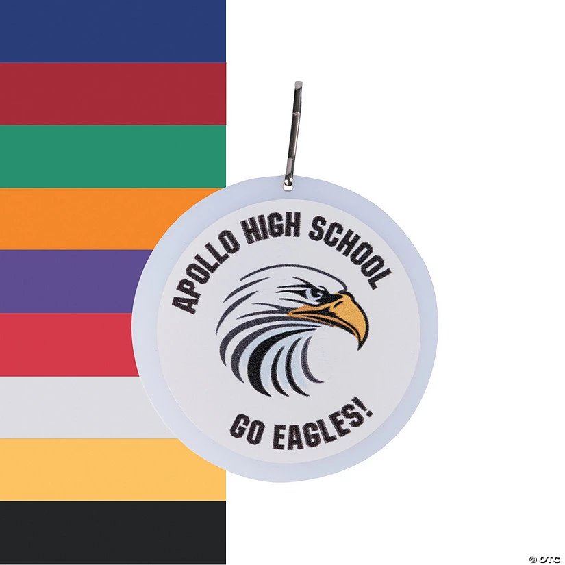 Looking for a cool way to show your school spirit without being so loud and proud? Just clip it! These custom charms can be clipped to backpacks, purses, zippers and more, and with a short personal message in your school color everyone will know who you represent. Great for passing out during pep rallies, booster clubs or school fundraisers! Personalize with a 1-letter monogram and 1 line text. (2 dozen per unit) Each 2 1/2″ diam. plastic disk is on a 3/4″ metal clip. Character count will vary depending on font style and font size. © OTC