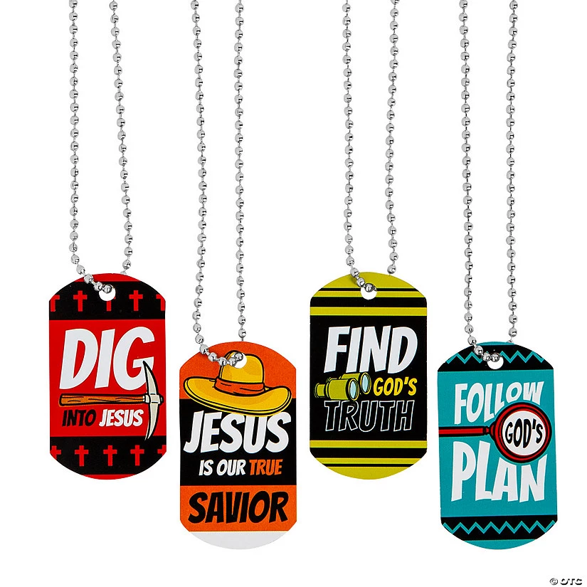 Help kids learn more about following Godās plan, finding Godās truth and digging into Jesus with these cool dog tag necklaces. Great as Dig VBS handouts or prizes, each dog tag necklace features an image and message that corresponds with Dig VBS curriculum. You can also use these dog tags to designate different teams or to display accomplishments. Metal. 2″ dog tag on a 24″ ball chain. Ā© OTC