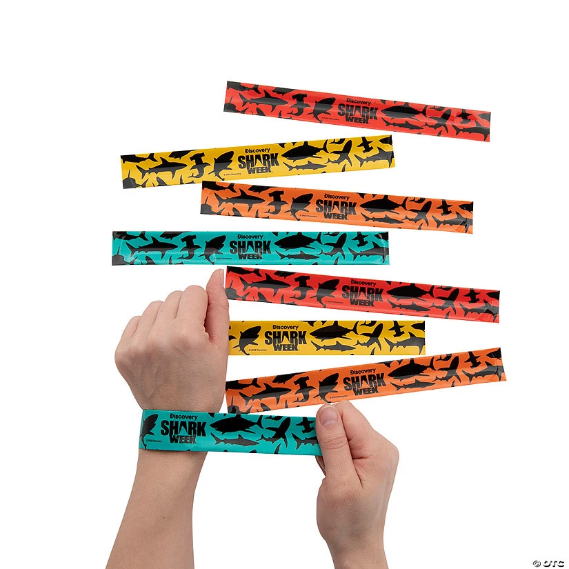 Celebrate the best week of television viewing all year: Discovery Channel’s Shark Week! These colorful slap bracelets feature shark silhouette images along with Shark Week messaging. Perfect as party favors for a Shark Week viewing party, these slap bracelets will also prove popular as classroom prizes and rewards. Metal. 9″ x 1″ Only at OTC / ©2022 Discovery