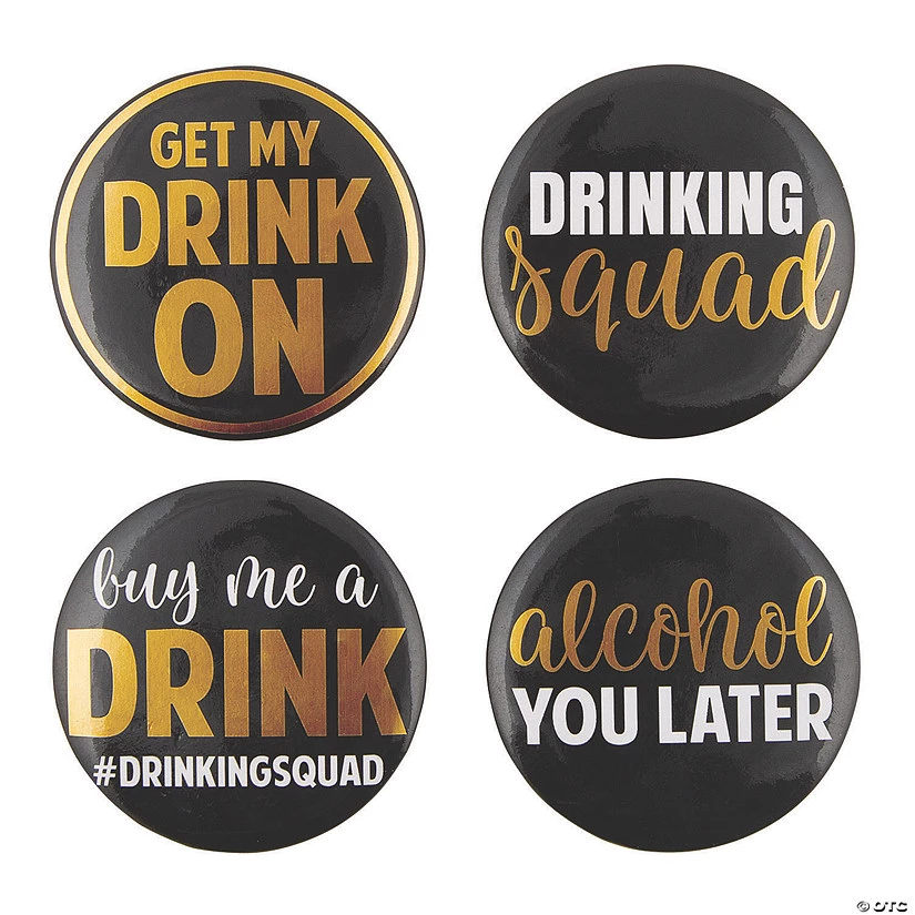 Get your drink on in style! Great for bachelorette party supplies, these big buttons come printed with fun sayings like âDrinking Squadâ or âAlcohol You Laterâ. Beyond a night out with your favorite bride-to-be, these can be sported during a birthday bash too. Party favors like this will stand out in all your snapshots! Metal. (2 dozen per unit) 2″ Š OTC