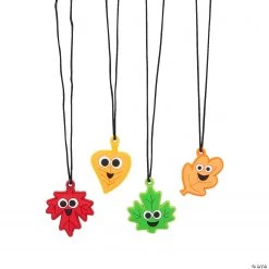 Smiling leaf characters are the perfect charms for fall necklaces! Celebrate autumn and the changing of the season with these adorable necklaces. Great as Harvest festival prizes, classroom rewards or as party favors for a fall party, these cute necklaces each have a breakaway cord for safety and an adorable, smiling leaf. Rubber. (4 dozen per unit) 1 1/2″ with 24″ breakaway cord. © OTC