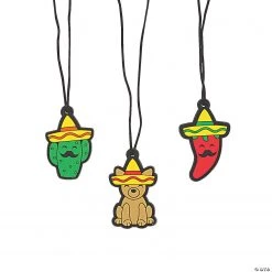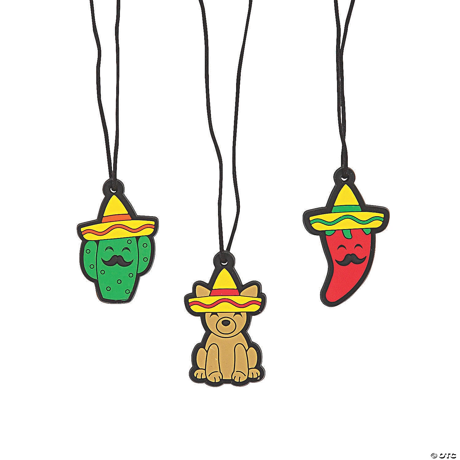 Feast your eyes on these fiesta animal necklaces, just right for carnival prizes, birthday party favors and other giveaways. Featuring cute fiesta-themed characters complete with traditional sombreros. Qué bonita! Silicone. 2″ charm on a 24″ breakaway satin cord. © OTC