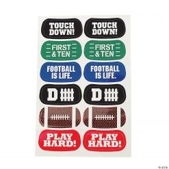 Football Face Tattoos. Wear these fun Football Face Tattoos to the big game, a pep rally or homecoming! Designs include “Touchdown!, First & Ten, Football is Life., D Fence, football & Play Hard!”. Includes 1 dozen 1 3/4″ tattoos per sheet. Easy to apply and remove. Safe and non-toxic. (6 sheets per unit) Š OTC