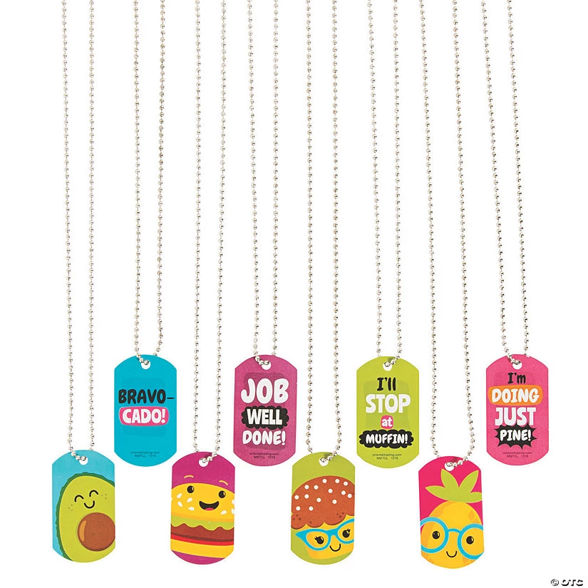 This fashion is simply funtastic! A great addition to classroom rewards, these necklaces feature smiling images of muffins, hamburgers, pineapples and avocados as well as witty yet inspiring sayings. Little learners love food and they love dog tag necklaces, so they are sure to work hard and exemplify their best behavior to earn one of these! Metal. 2″ dog tag on a 24″ ball chain. © OTC