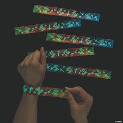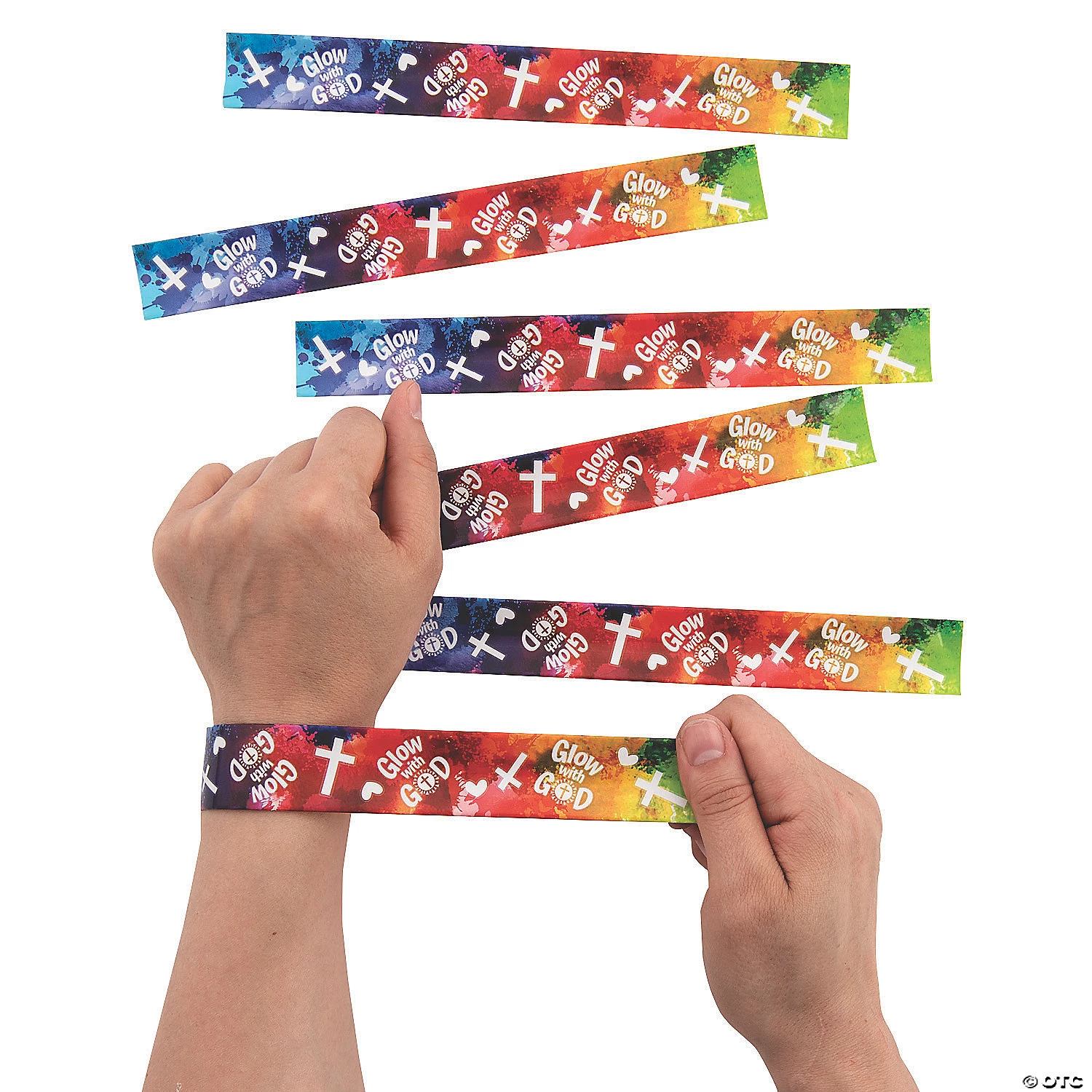 Searching around for religious accessories for kids? Great for party favors and prizes, these slap bracelets actually glow in the dark! Each colorful bracelet is printed with, “Glow with God” and cross designs. Metal. 9″ Expose items to direct daylight to activate glow. © OTC