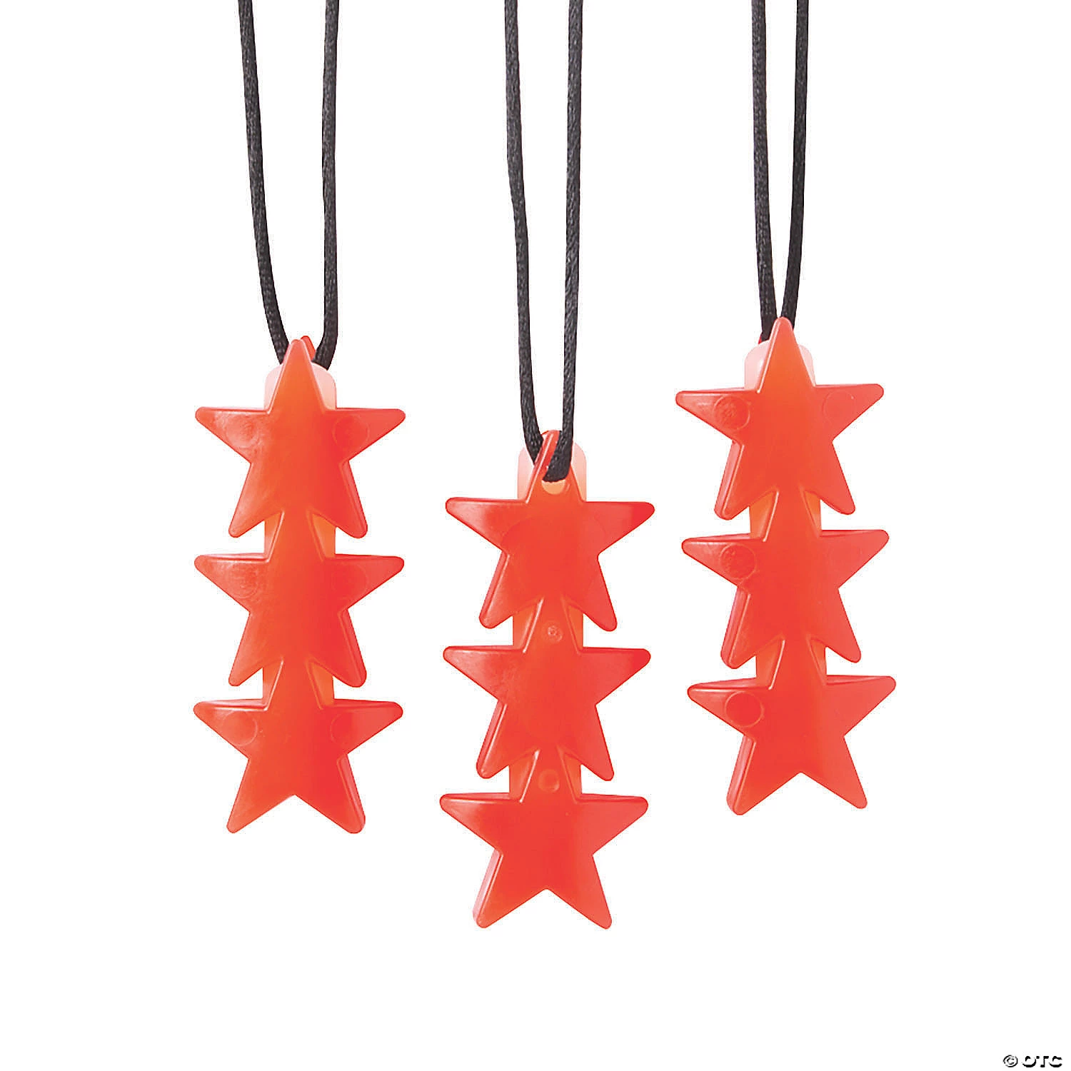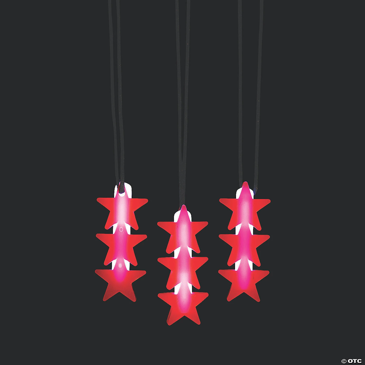 Lady Liberty herself would wear one of these…well, if they could fit around her neck that is! Showing three red stars that illuminate like fireworks in the sky, these glow accessories are a bright addition to patriotic party favors and Fourth of July giveaways. Kiddos will love sporting these as night falls and they wait for the sky to be filled with bursting colors! Just snap and insert the 2″ glow stick. Plastic. 3″ charms on 33″ cords.