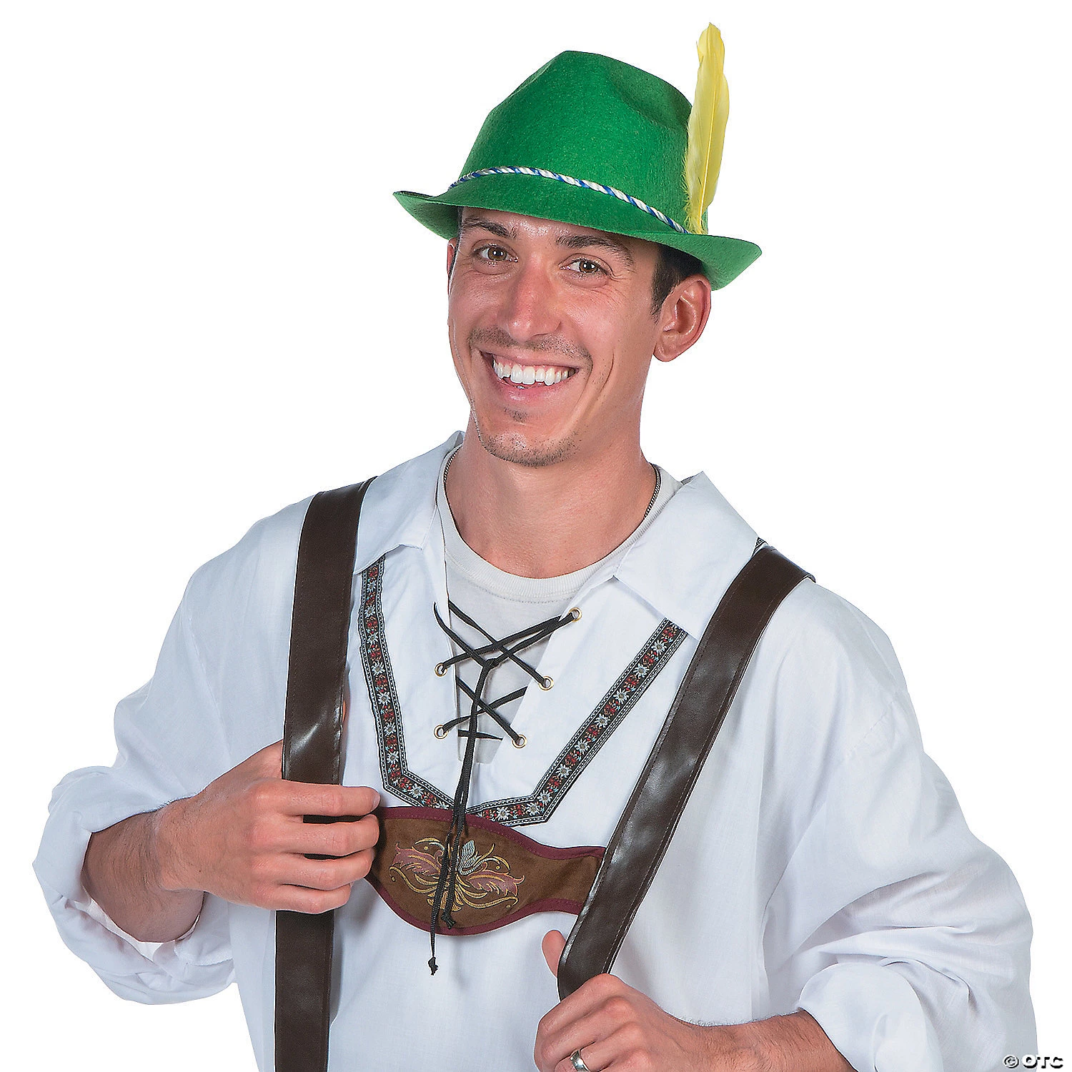 Can you hear that? Bavaria is calling! Dress yourself for Oktoberfest when you put on this Green Oktoberfest Alpine Hat. Perfect to wear to your Oktoberfest party, or to include with the rest of your outfit, this felt hat is sure to help you set the scene for a celebration! Features a yellow feather and a blue and white cord hatband. 5 1/2″ x 10″ x 24″ circ. © OTC