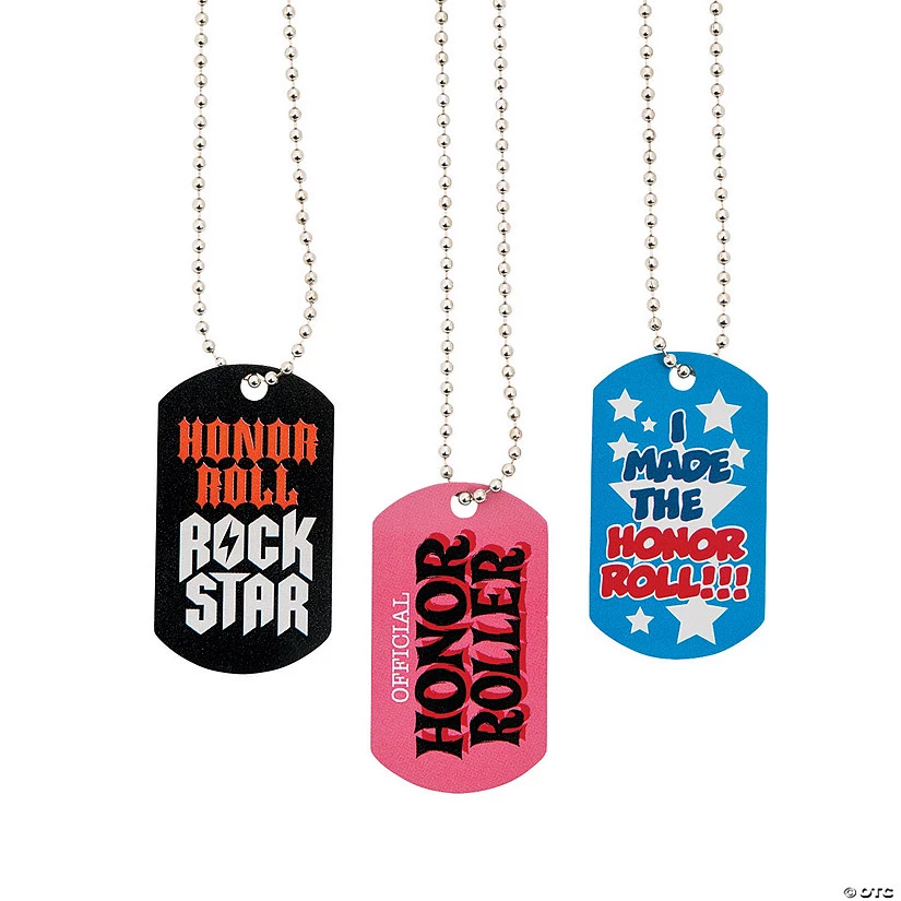 “Honor Roll” Dog Tag Necklaces. Celebrate their hard work! “Honor Roll” Dog Tag Necklaces are a fun handout in the classroom that kids will be proud to wear. Designs include: “Honor Roll Rock Star”, “I made the honor roll!” and “Official honor roller”. Each includes a 2″ dog tag on a 23″ silvertone chain. Metal. © OTC