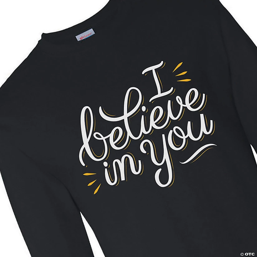 Send positivity out into the world with this comfy t-shirt. Encourage those around you with the positive message featured on this long sleeve t-shirt. This attractive shirt carries the message, “I believe in you”, a message that might be exactly what someone needs to hear! Wear this shirt to graduation celebrations or any other event where encouragement is helpful. © OTC