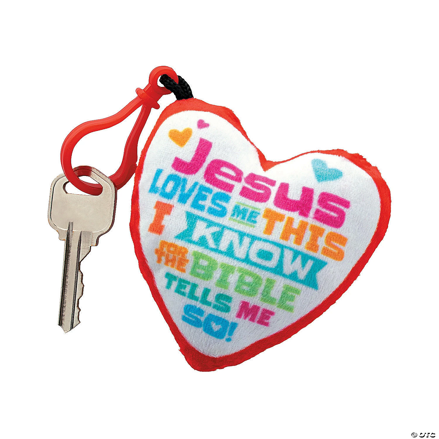 Instead of wearing your heart on your sleeve, wear Jesus on your heart with this heart-shaped faith keychain! Featuring the uplifting message that “Jesus loves me this I know, for the Bible tells me so” and a convenient backpack clip, this plush heart serves as a powerful reminder of Jesus’ love. Hand these out as Sunday School giveaways, birthday gifts or additions to your little ones’ school supplies. 3″ x 3″ on 1 1/2″ plastic clips. © OTC