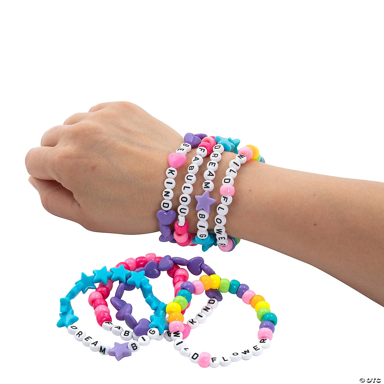 This assortment of colorful beaded bracelets features cute messages on each bracelet in letter beads. “Be kind”, “Dream big” and “Fabulous” are a few of the messages featured within this assortment of beaded bracelets. Great as party favors for a young girl’s birthday party or as classroom prizes and rewards, these bracelets will be a hit with kids! Plastic. (2 dozen per unit) 1/2″ beads with 7 1/2″ stretchy cord. Assortment may vary. © OTC