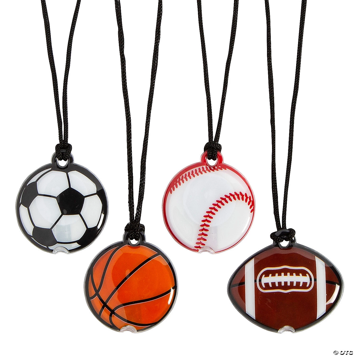 Late practice? No problem! Sports ball necklace flashlights will light the way! Kids can choose their favorite sport, whether itās basketball, baseball, football or soccer. Whenever they need a little extra light, they just have to pinch their necklace. These wearable giveaways also make great classroom prizes, team handouts or sports birthday party favors. Plastic. 2″ ā 2 1/2″ icons on a 24″ breakaway cord. Includes batteries. Ā© OTC.