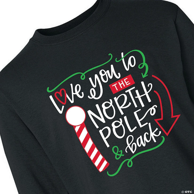 This shirt is definitely on Santa’s nice list! Printed with “Love you to the North Pole & back,” this youth T-shirt is a holly, jolly choice for holiday events and family Christmas photos. Your little elf will look cute as a button wearing this comfy Christmas T-shirt. The red, white and green design features a swirly font, a striped pole and fun accent shapes. © OTC