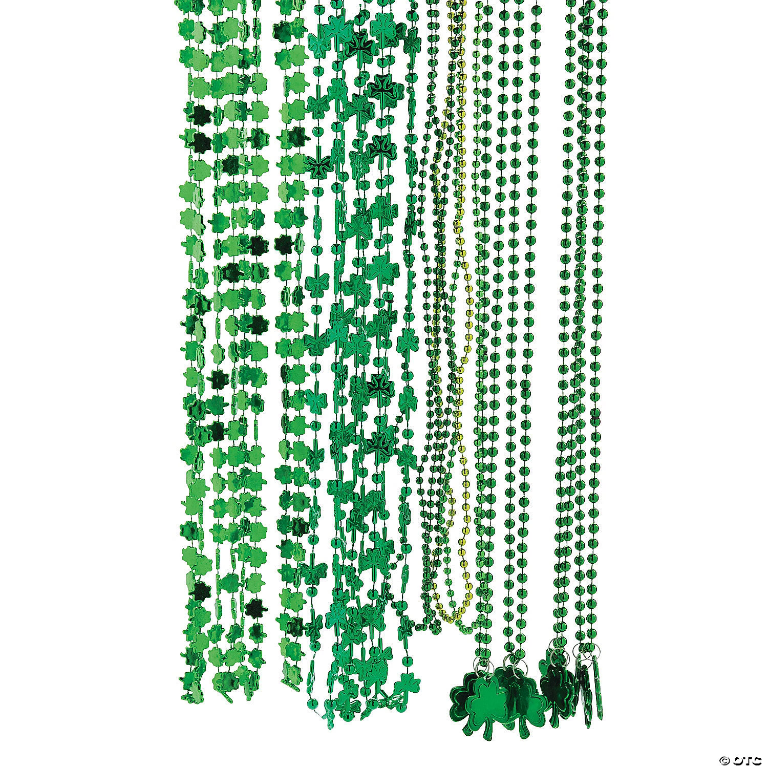 Don’t ever get pinched again! Just share the luck of the Irish with this large assortment of St. Patrick’s Beaded Necklaces. They’re fun to wear at St. Patrick’s parties, parades and all day celebrations. Toss them on tabletops to use as St. Pat’s decorations or place them in party favor bags. Let your inner Leprechaun enjoy the holiday with this pretty green bling! Plastic. (6 dozen per unit) 33″ Assortment may vary.