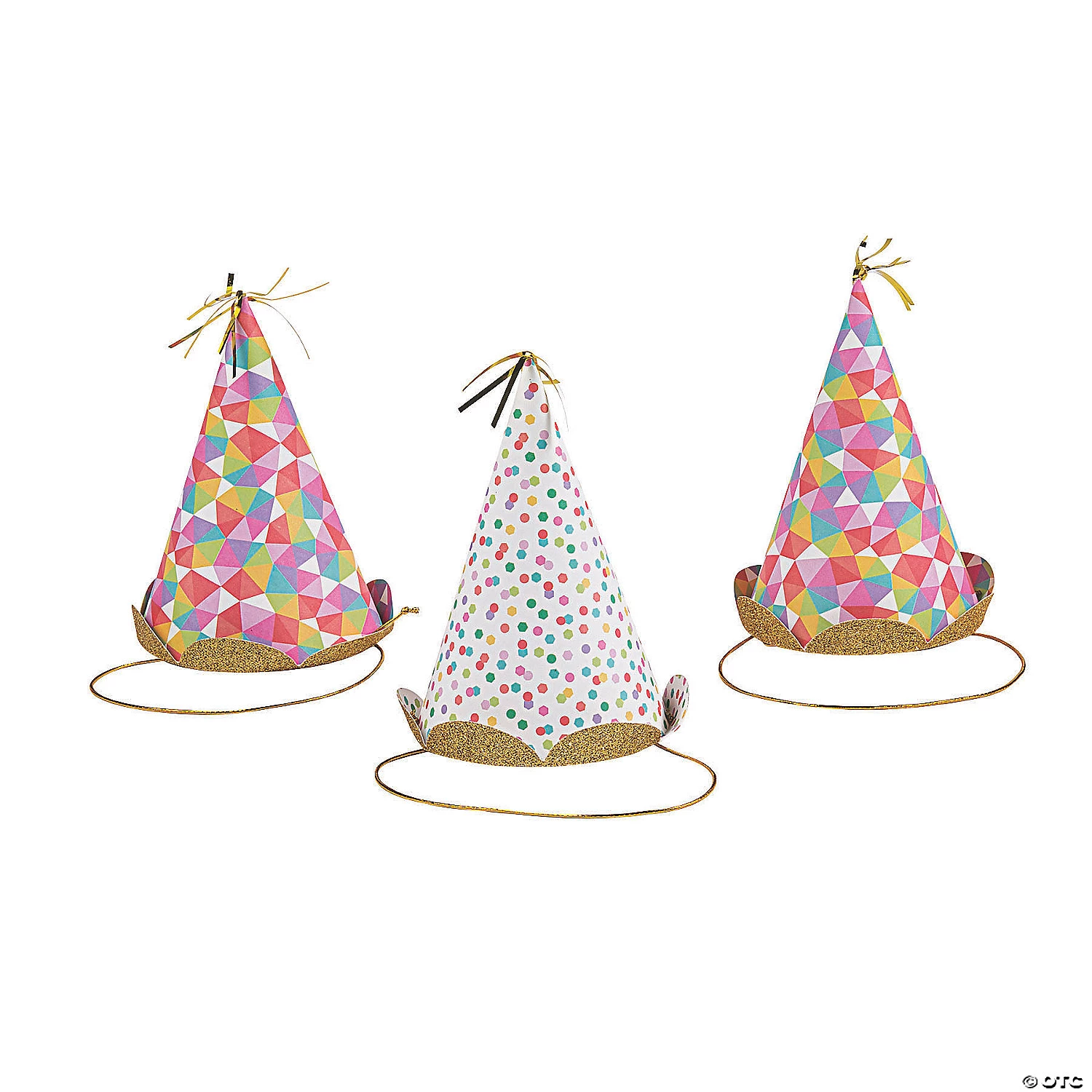 Top off your party supplies with these Mini Confetti Cone Party Hats! Theyâre printed with brightly colored patterns and have gold glitter accents around the bottom and gold foil streamers at the top. Stock up on these party supplies for your little girlâs birthday party or use them as photo booth props for your next event! Kids and adults alike will love wearing the silly mini hats! Paper with elastic string. (6 pcs. per unit) 4 1/4″ x 5″