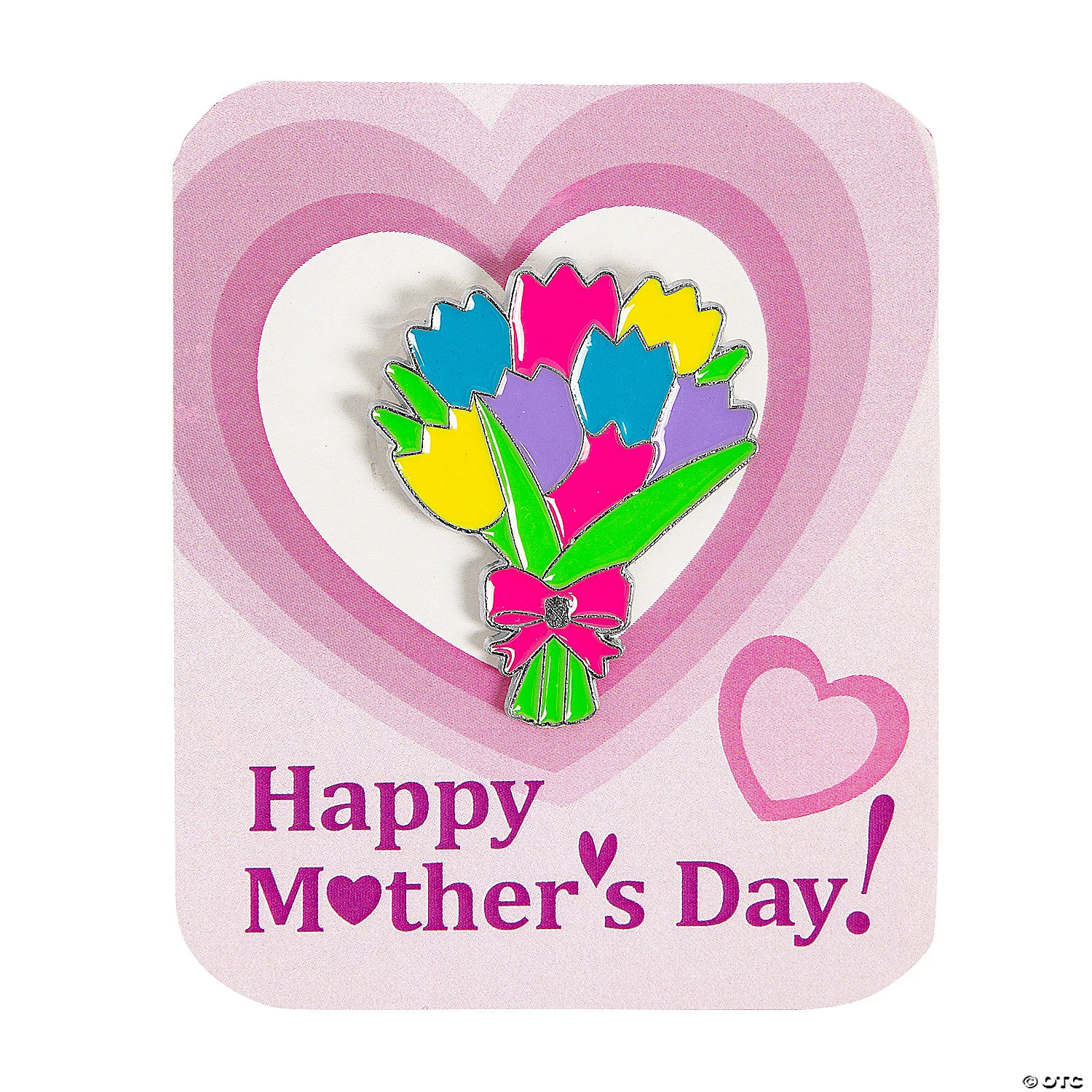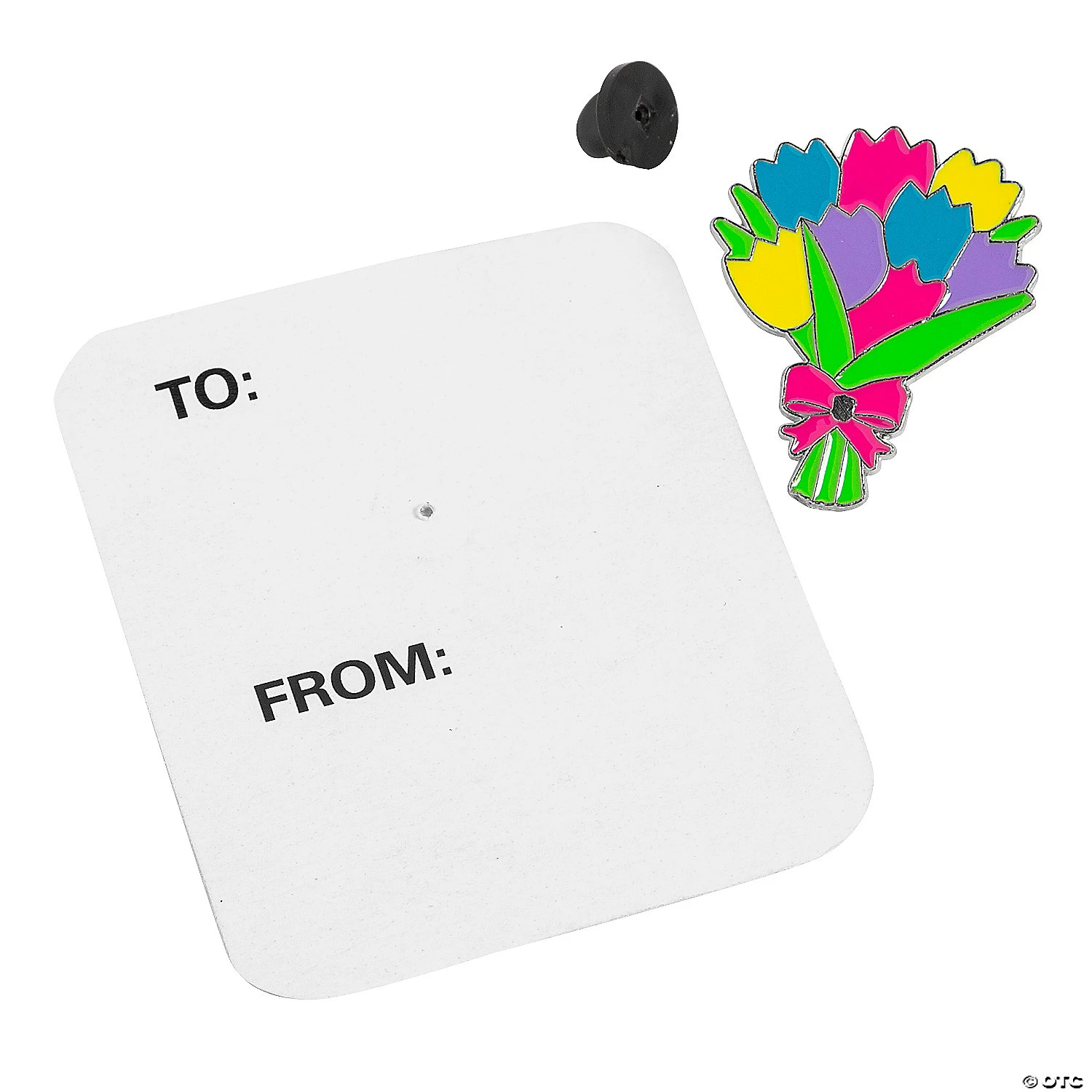 Let moms know they’re appreciated with these lovely bouquet pins on cards featuring a “Happy Mother’s Day” message along with a To/From space on the back. A fantastic choice for Mother’s Day handouts or to give to kids to gift to their moms, this pin looks like a colorful bouquet of tulips and features heart images on the cards. Metal. 1 1/2″ pins with 2 1/2″ x 3 3/4″ cardstock card with To/From space. © OTC