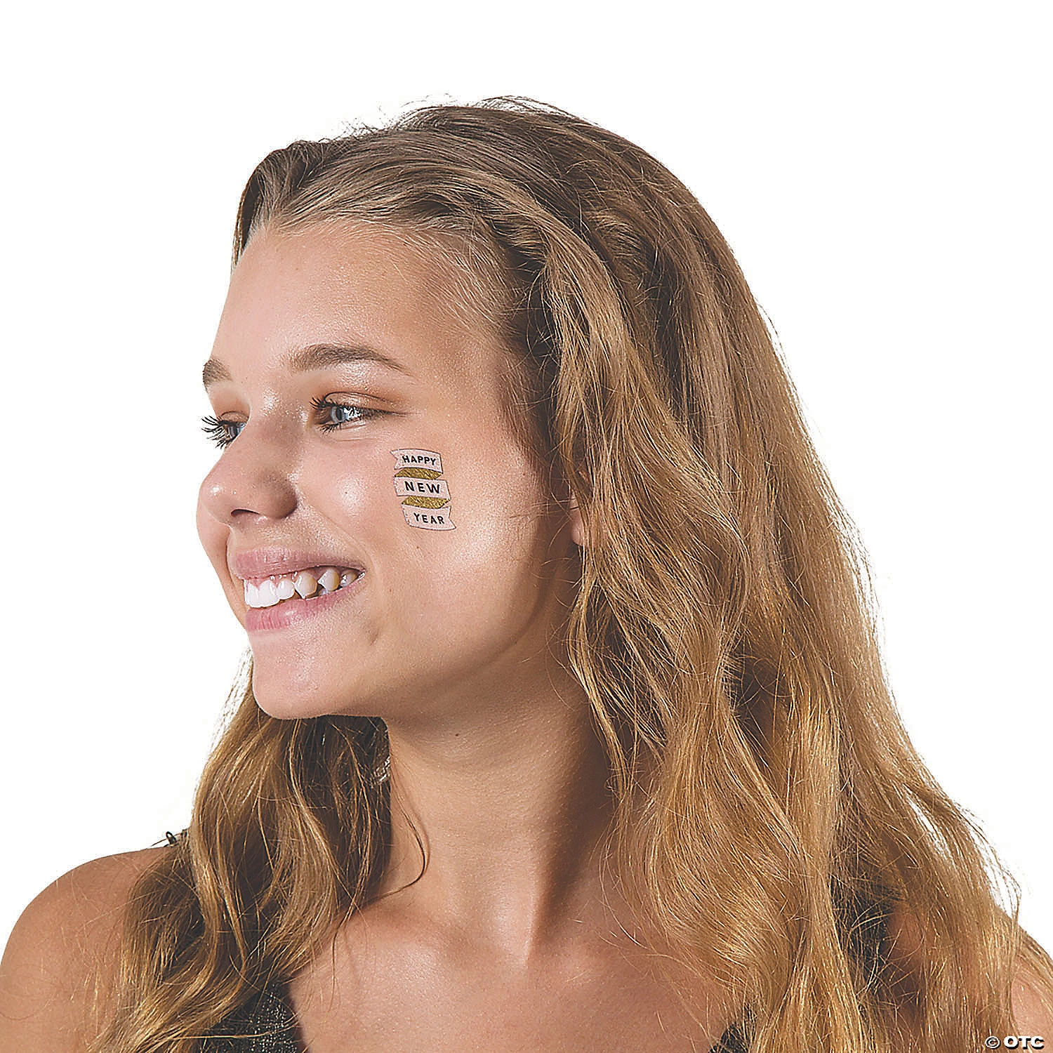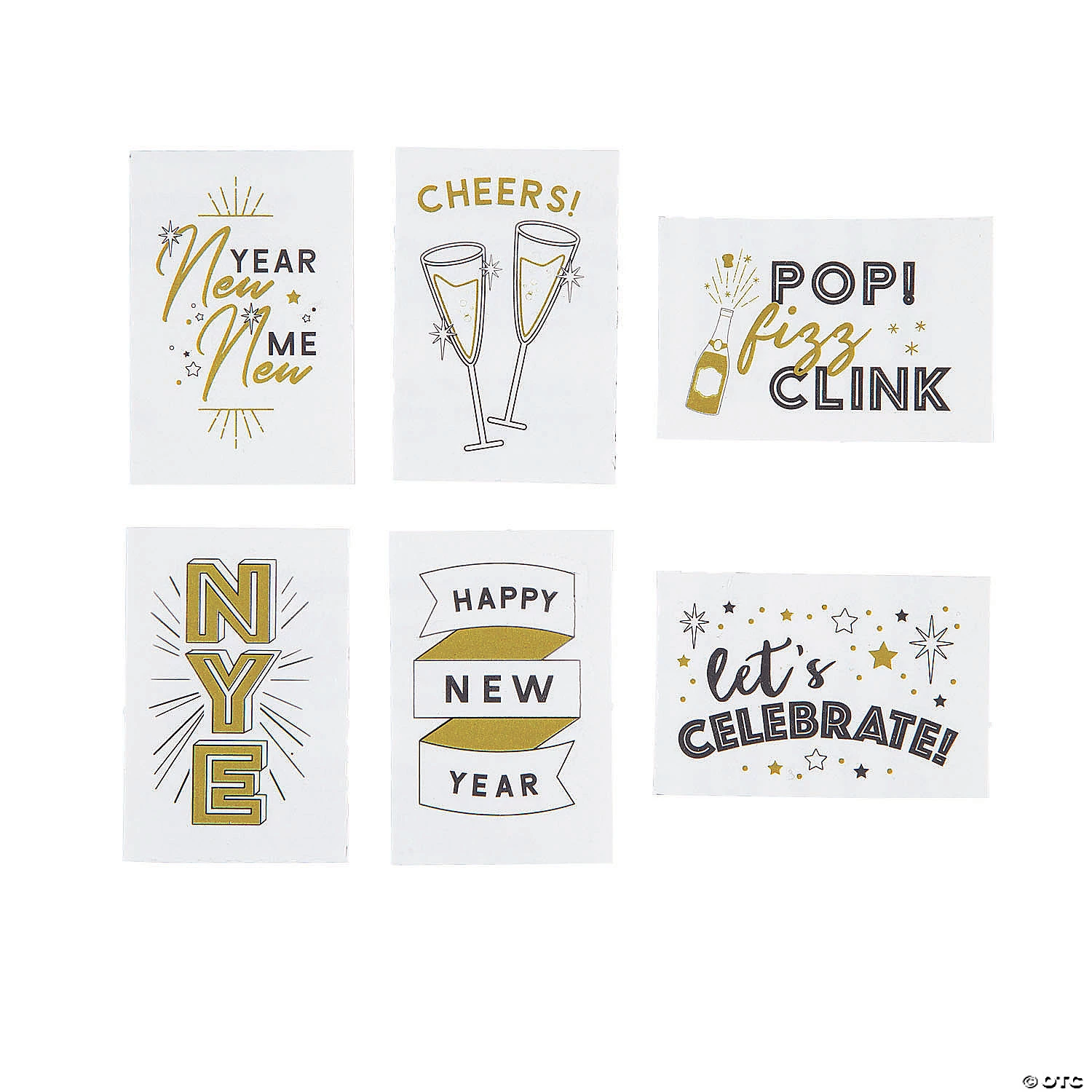 Add a little glitz and glamor to any New Year look! Featuring gold designs of confetti, stars, champagne glasses and more, these temporary tattoos are a great addition to New Year’s Eve party favors and giveaways. Whether sported on the cheeks, back of a hand or a shoulder, these make your festivities all the more fabulous and fun! Easy to apply and remove. Safe and non-toxic. (6 dozen per unit) 3″