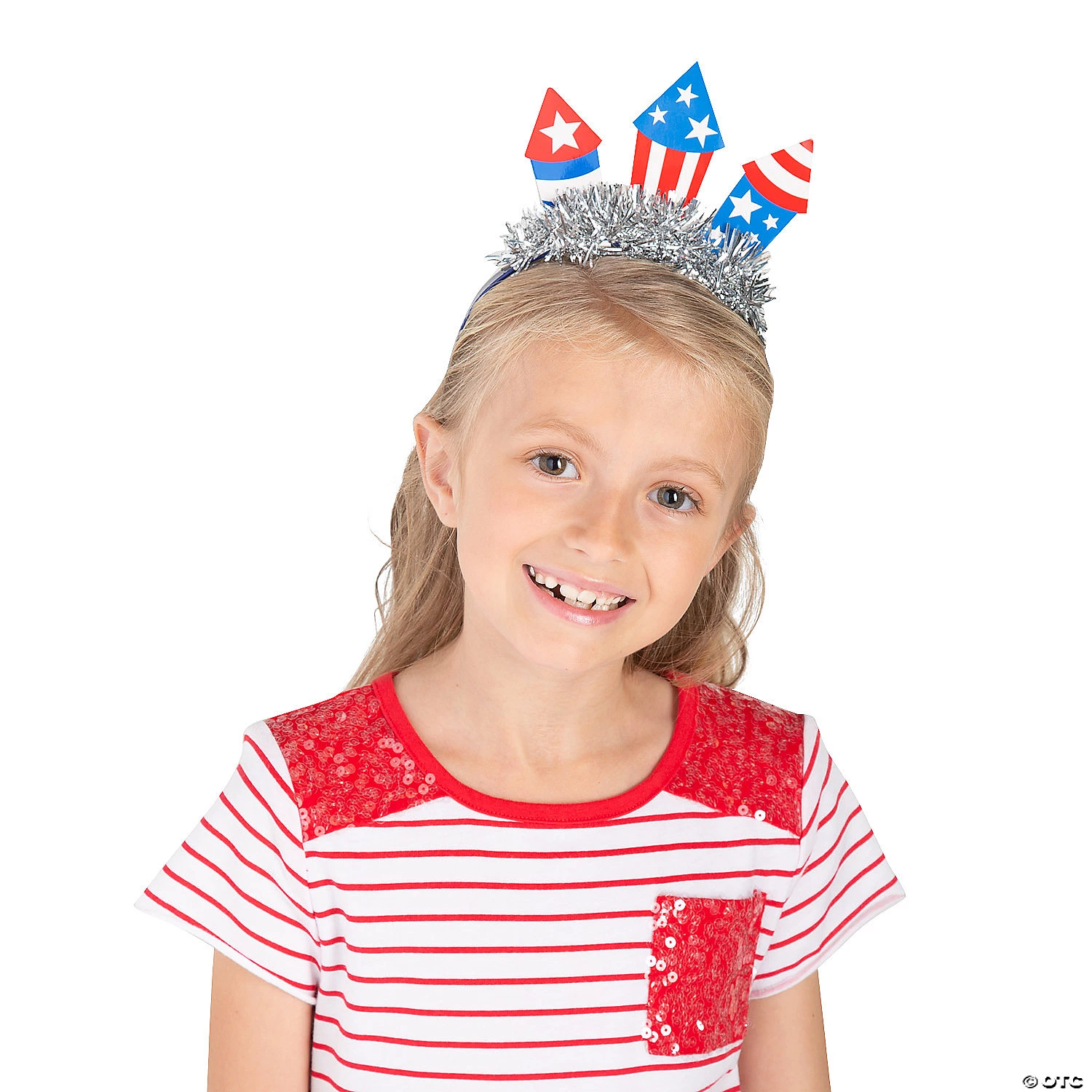 While itās generally not advisable to place firecrackers on your head to show off your patriotism, itās safe to do it with these cute headbands! Each eye-catching headband has silver foil and firecracker-shaped toppers in red, white and blue, making these the perfect headbands to wear as Fourth of July accessories. Plastic. 5″ x 5″ with 5″ – 5 1/2″ cardstock toppers. Ā© OTC