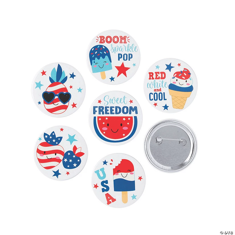 These buttons are red, white and cool! Hand these accessories out as Fourth of July party favors, add them to carnival prize bins or use them as classroom behavior incentives. Featuring sweet treats and patriotic colors, these buttons are perfect for pinning to backpacks or outfits! Metal. (2 dozen per unit) 2″ © OTC
