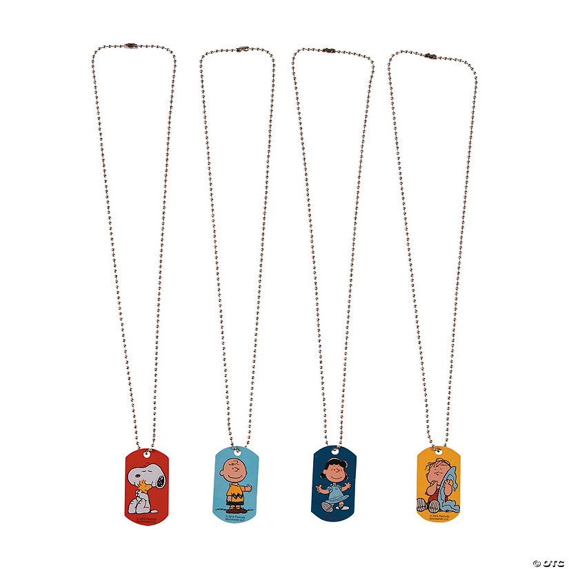 These dog tag necklaces make perfect giveaways, rewards and gifts for any occasion. Each dog tag is imprinted with your favorite Peanuts characters, from Linus to Lucy, the gang’s all here! Metal. Each 2″ dog tag comes on a 24″ ball chain necklace. Only at OTC / © 2015 Peanuts Worldwide LLC