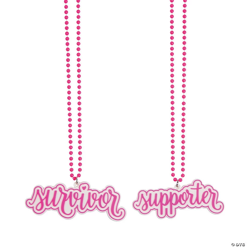 Now there’s a way for both survivors and supporters to standout! Great for awareness event giveaways, these beaded necklaces come in vibrant pink and feature charms that distinguish these two groups. It’s a great way to acknowledge that both are working together to get through this fight and find a cure. Guests and participants will love wearing these during community races, fundraiser events, awareness speeches and more! Each 32″ beaded chain with breakaway clasp features a 3 3/4″ charm. Plastic. © OTC