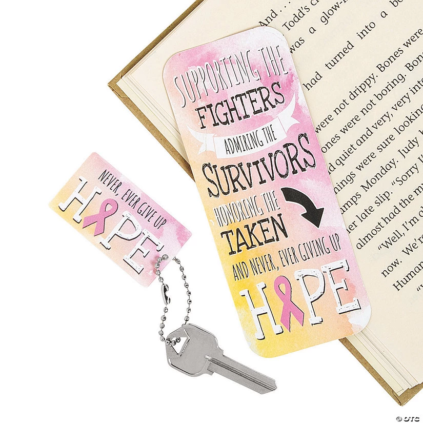 These bookmarks and keychains make heartfelt giveaways and tokens of hope. Whether you use them for fundraiser or awareness event giveaways, or you or a loved one is fighting against breast cancer, these inspirational giveaways are a great pick. Includes 12 bookmarks and 12 keychains. Cardstock and plastic. (2 dozen per unit) Bookmark, 2 1/4″ x 5 1/2″; keychain, 2 1/4″ with a metal ball chain. © OTC