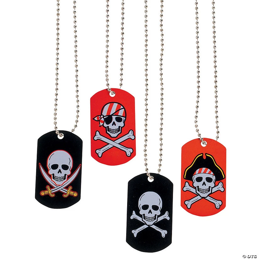 Instantly get into the Halloween spirit with this fun assortment of Pirate & Crossbones Dog Tag Necklaces. This Halloween jewelry is the perfect costume accessory for your next Halloween party at home or school. Use them to fill your gift bags or give them away as a raffle prize at your Halloween event. Whether trick or treating with your kids, attending a costume party or staying home to pass out candy, these Pirate & Crossbones Dog Tag Necklaces are a must have for kids and adults alike! Be sure to give one to each of your best crew mates! Each 2″ metal dog tag hangs on a 24″ silvertone metal chain. Assorted. © OTC