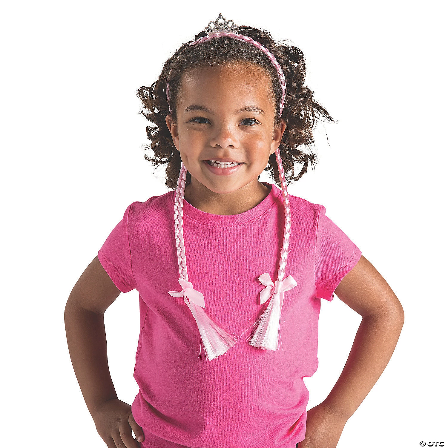 Turn anyone into a princess with pretty pink braids with these cute tiara headbands! Perfect party favors for a princess party, these costume accessories will be a hit with your little royal partygoers. Ask them to dress up in their favorite princess costume, too! Plastic with synthetic hair. 5″ x 5 1/2″ headbands with 18″ braids.