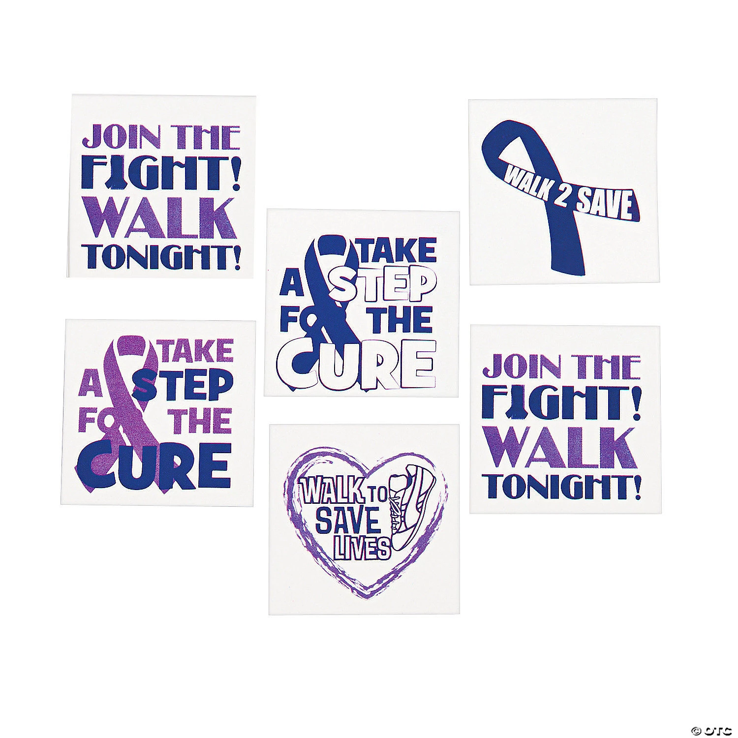 Stick these Purple Awareness Ribbon Tattoos on so you can show your support every step of the way! Great for race day, team events and more, these temporary tattoos are a fun way to support your cause. No matter what the purple ribbon means to you, these purple ribbon tattoos will help unite your team and show your heartfelt support. Messages include, “Join The Fight! Walk Tonight!” and, “Take A Step For the Cure”. Easy to apply and remove. Safe and non-toxic. Paper. (6 dozen per unit) 1 1/2″ © OTC