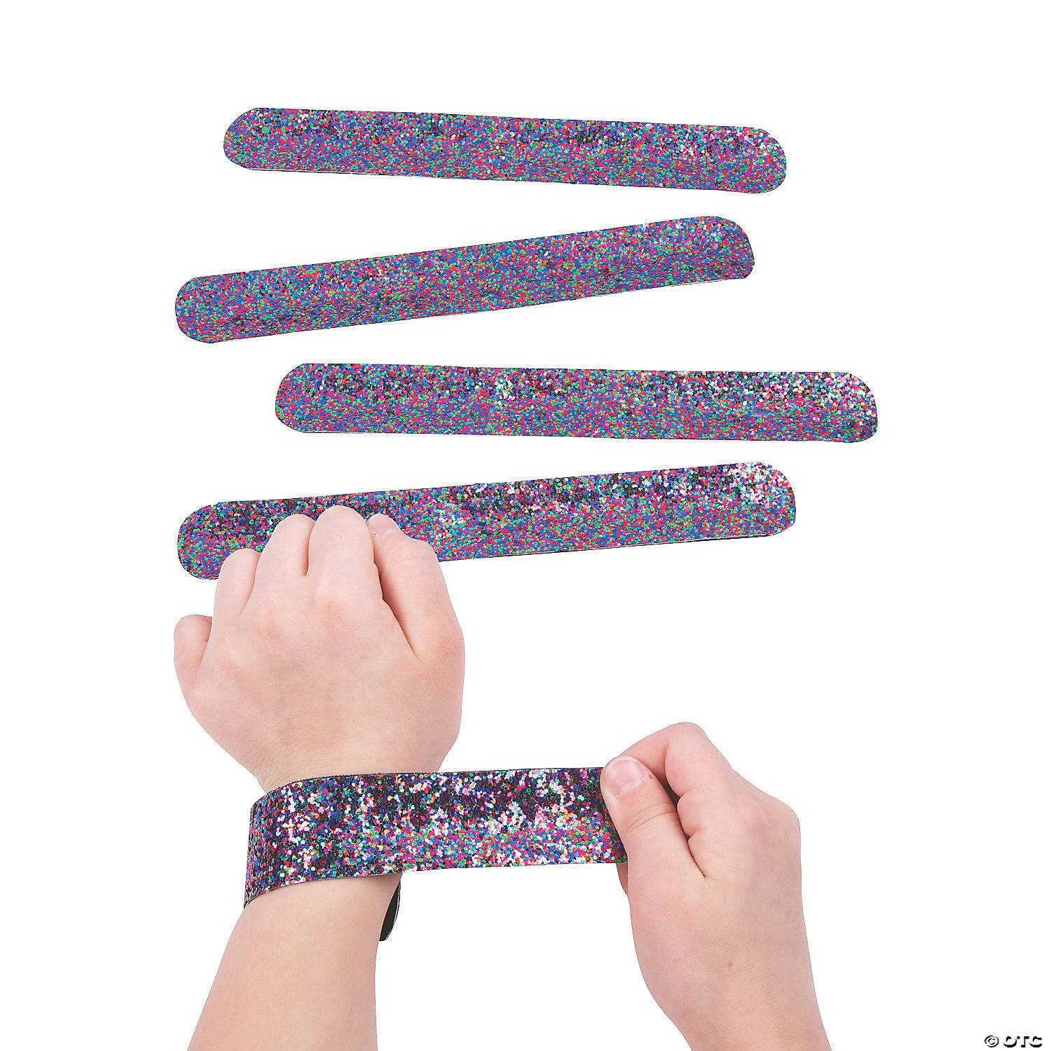 Add a bit of sparkle to your wrists with these Rainbow Glitter Slap Bracelets! Encrusted with multicolored glitter, the slap bracelets make every day more fun. The glittering bracelets make great giveaway items for girls and are perfect for birthday party favor bags. Kids can’t resist slapping the bracelets into place! Metal. 8 3/4″ © OTC