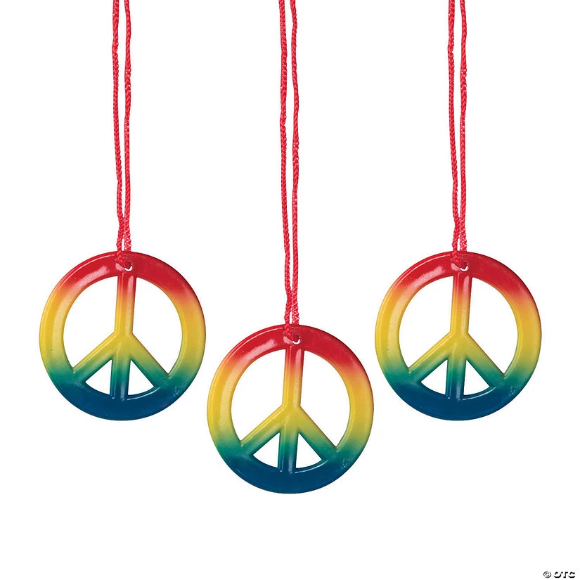 Rainbow Peace Sign Necklaces. A fun favor at a “blast from the past” party, these colorful â60s-inspired jewelry will make you feel groovy! Perfect for complementing a tie-dye shirt or to finish off your hippie costume for Halloween, each colorful 2″ pendant is on a 23″ cord. (4 dozen per unit)