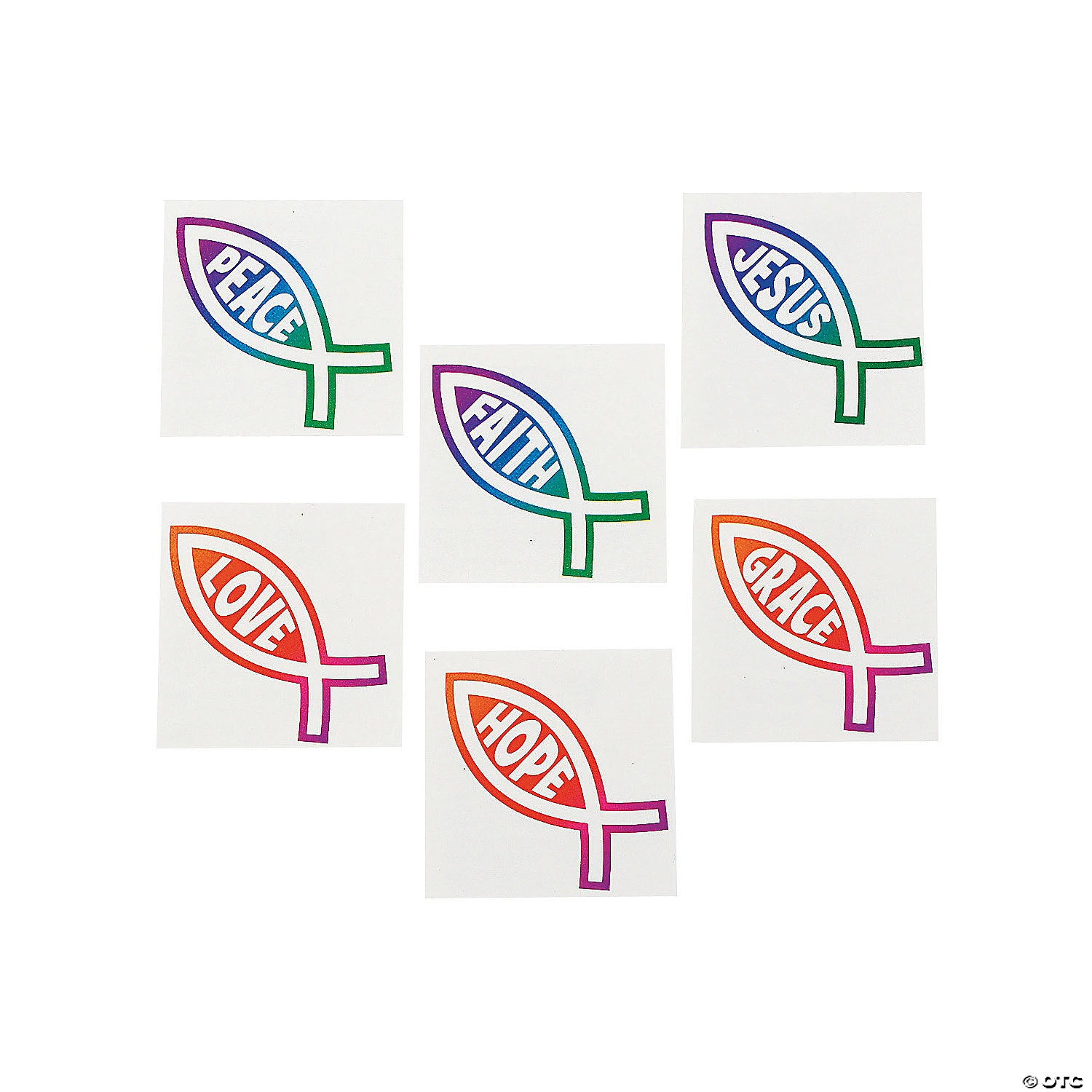 Wear your faith for all to see! These fish-shaped temporary tattoos are fun for Sunday School, VBS, Trunk or Treat giveaways, a Bible study group and party treat bags. Assorted designs include: Peace, Faith, Jesus, Love, Hope and Grace. Easy to apply and remove. Safe and non-toxic. (6 dozen per unit) 1 1/2″ © OTC