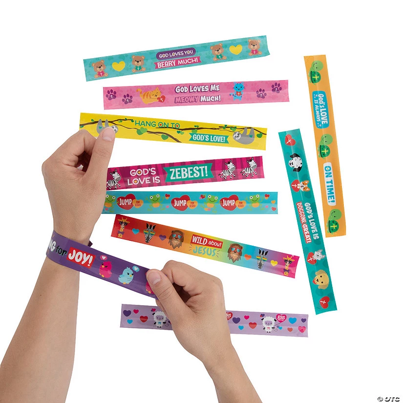 Kids love these trendy slap bracelets featuring smiling animals and faith messaging. Perfect as a Sunday School Valentine’s Day handout, these slap bracelets featuring messages about God’s love can be a great addition to the prize box and given out any time of the year. Restock your Sunday School classroom’s prize stash with the help of this impressive slap bracelet assortment. Metal. (50 pcs. per unit) 9″ x 1″ Assortment may vary. © OTC