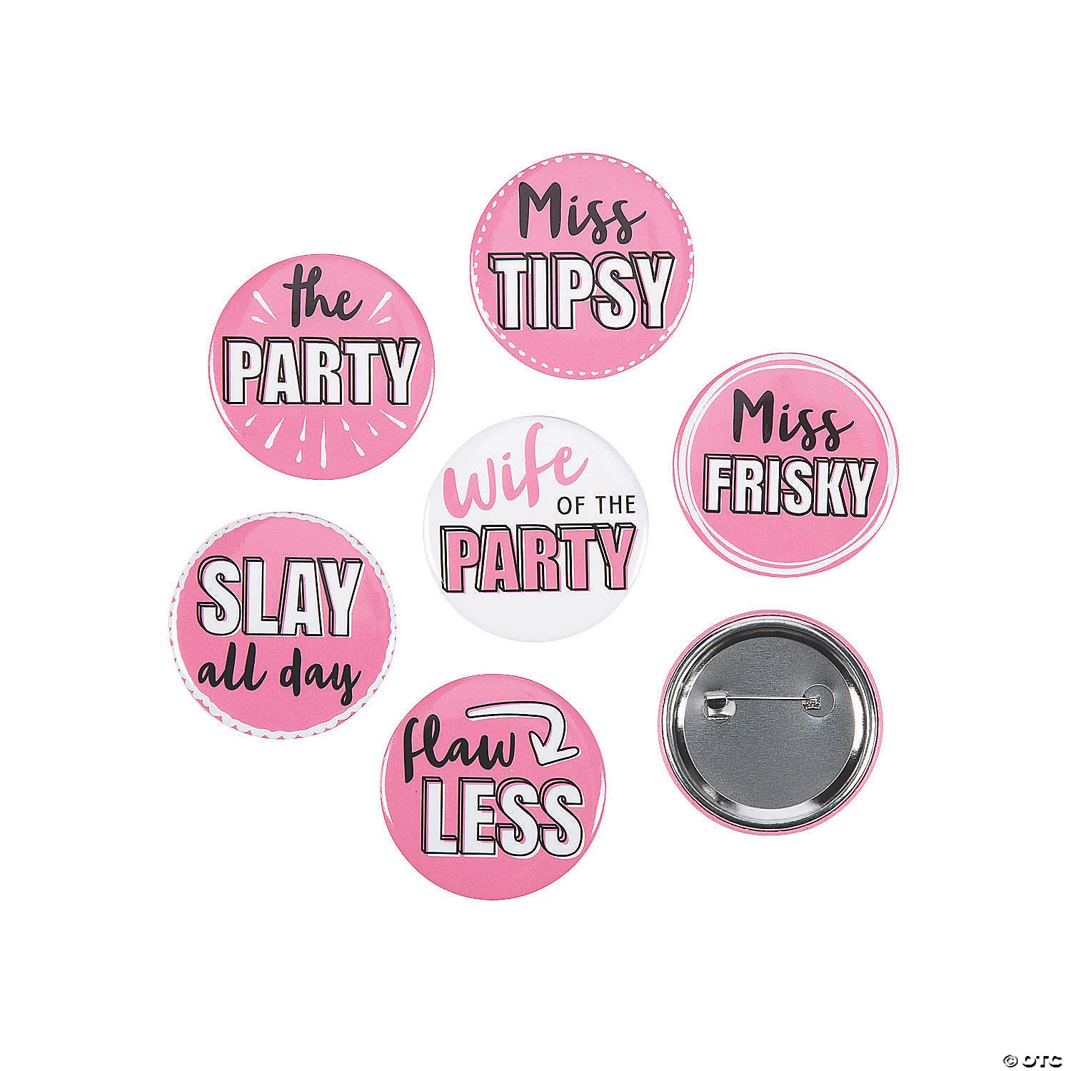 Prim and proper bachelorettes need not apply with these sassy buttons. Get ready to take the bachelorette party to the next level with buttons best suited for the most vivacious of guests. Pass these out at the bachelorette party or wear them out to draw attention to your sassy group. You’ll be the “Wife of the Party” with these fun buttons! Metal. (24 pcs. per unit) 2″ © OTC