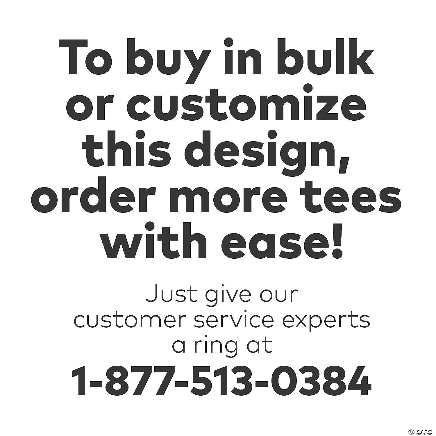 • Need more? With our tees, we’ve got your back (and front)! To order in bulk for any size group, just call 1-877-513-0384. Or, give us a ring if you’d like to easily customize any of our pre-printed shirts with our free design service. © OTC
