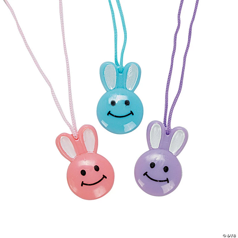 Smile Face Bunny Necklaces. Grinning from bunny ear to bunny ear, these vinyl pastel rabbits are sure to bring smiles to children everywhere! A real crowd-pleaser, these 1 1/4″ vinyl bunny pendants hang on a 24″ cord. (6 dozen per unit)