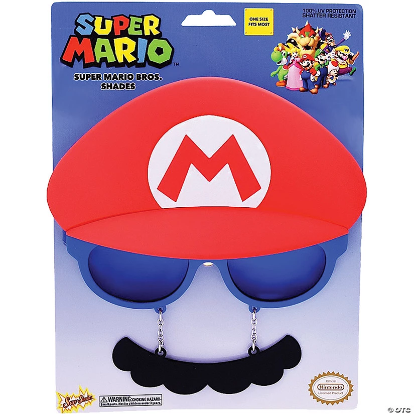 Sunstache Super Mario Bros ShadesRescue Princess Peach with a classic plumber look. Includes: Glasses are topped with the familiar red Mario hat shape and the signature mustache is hanging beneath. 100% UV protection, shatter resistant. Available Size: One Size fits most Adults This is an officially licensed Nintendo product.Special Shipping Information: This item ships separately from other items in your order. This item cannot ship to a P.O. Box. This item may be subject to additional processing days.ITEM IS NOT ELIGIBLE FOR EXPEDITED SHIPPING